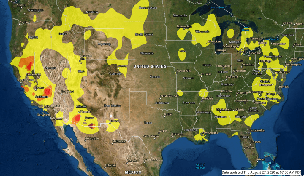 That said, in this combustable landscape that seems to map the intersection of lightning strikes against remaining areas of what was once green, when we seem to be asked to say goodbye to stretches of old growth forest in Big Basin near Santa Cruz and down the coast in Salinas, the Marin Headlands, and across parts of the Sierra Nevada, amidst the puncturing of California, there is an odd sense of the pausing of that onslaught, as pools of poor quality air retreat in loopy ways over an ESRI terrain view, nationally,