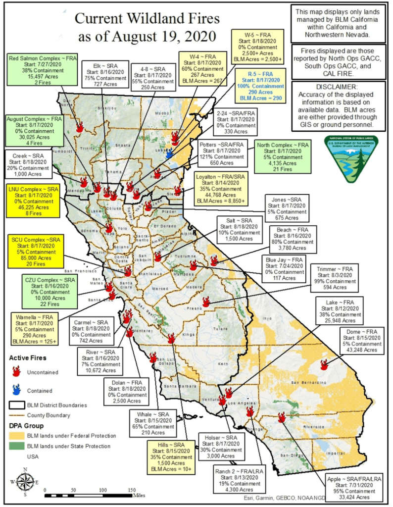 The challenge of their containment efforts were challenged as the LNU complex in Sonoma and Napa stood at only 22% containment but fire fighters were “feeling confident” while the raging SCU complex near San Jose stood at 10% containment, and growing marginally. Fires were only expected to grow as fires spread over a climate change emergency in land filled with dry underbrush where old forests offered huge loads of fuel in immediate vicinity, and forests had been poorly tended or maintained. While the containment of initial complexes was the immediate focus of attention, attracting much initial mapping, by a composite of satellite views and land-mapping, offering real-time maps of the fires’ spread, the boundaries of fires grew increasingly unclear as they proliferated and were spread by hundred-degree winds across by the end of the month.
