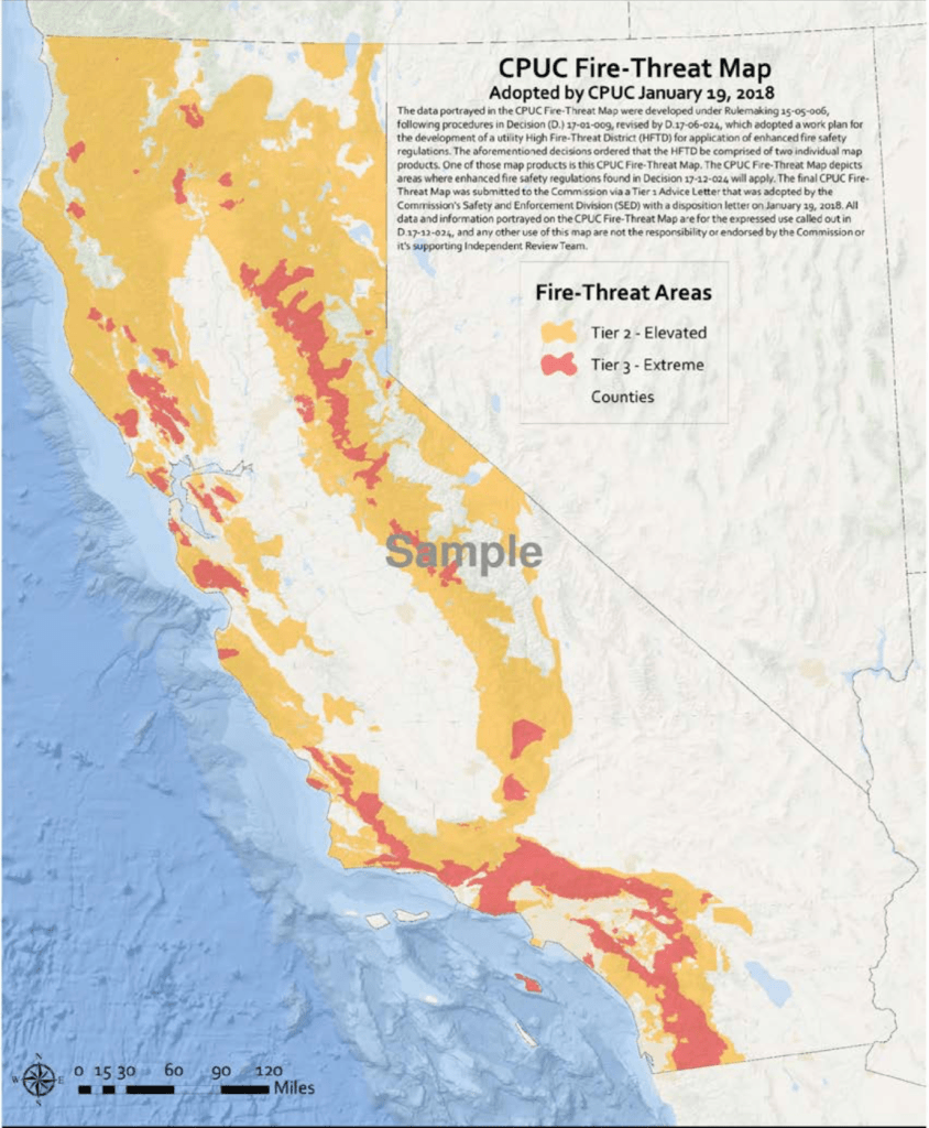 The more recent two-tiered Fire-Threat Map of the California Public Utilities Commission is less pointillist in scope, assessing county-based level of risk, to introduce clearer regulations in High Fire Threat Districts as of 2018, focus on regulating the wild land-urban interface and reflect the difficulties to contain fires in the very areas fires from lightning strikes occurred.