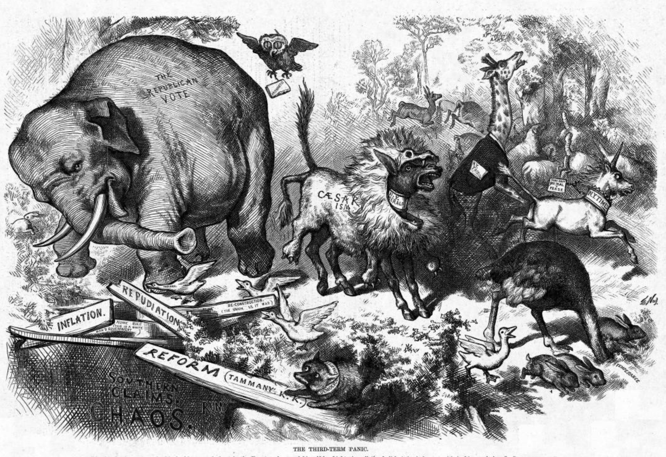 Was anyone aware of the racial connotations of purity by which the emblem of the elephant was claimed by Republicans in Reconstruction America? The preening insatiability of the red elephant communicated a sense of the eagerness of Republicans to map their candidate onto the body politic, a lumbering but advancing red behemoth, testifying to the electoral majority that the party would assemble in semaphore, in ways that the earlier tricolor icons of pachydermal stolidity had refused to capture as incarnations of a body politic. If the party’s stolidity seemed to convey a sense of order and conservatism in its earlier iterations, adding far more sobriety to an animal once figured by American cartoonists as a circus animal, from the time of the venerable Thomas Nast, master cartoonist of the late nineteenth century, the transmission of this partisan logo seemed to be less and less of a mascot of the party, than a symbol of purity. And if the elephant had become almost a glyph, robbed of semantic value–