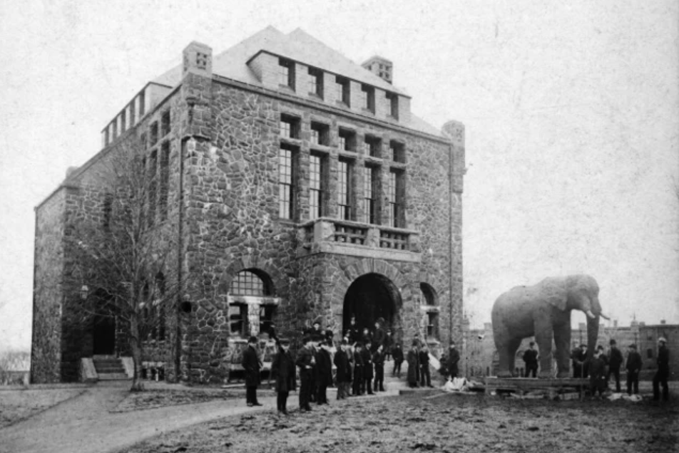 Barnum had cast the stuffed pachyderm Jumbo as an image of the “big tent” spectacle that he saw not only as conquering America but his unique legacy as a circus man: while a stuffed taxidermied elephant long displayed at the old Tufts College as a bequest from its first trustee, in 1889, after five years of using the taxidermied skin in his traveling menagerie. If the stuffed skin was worn from travel, Jumbo became a centerpiece for the Barnum Museum of Natural History that had opened in 1884, as a site for retired circus attractions; the fluidity of the circus to the hall of science is preserved in the statue of Jumbo raising a trunk outside Barnum Hall–“Barnum Fecit,” over its door–as symbolic center of Tufts campus tours–even if the stuffed hide of the elephant barely entered the doors of Barnum Hall.