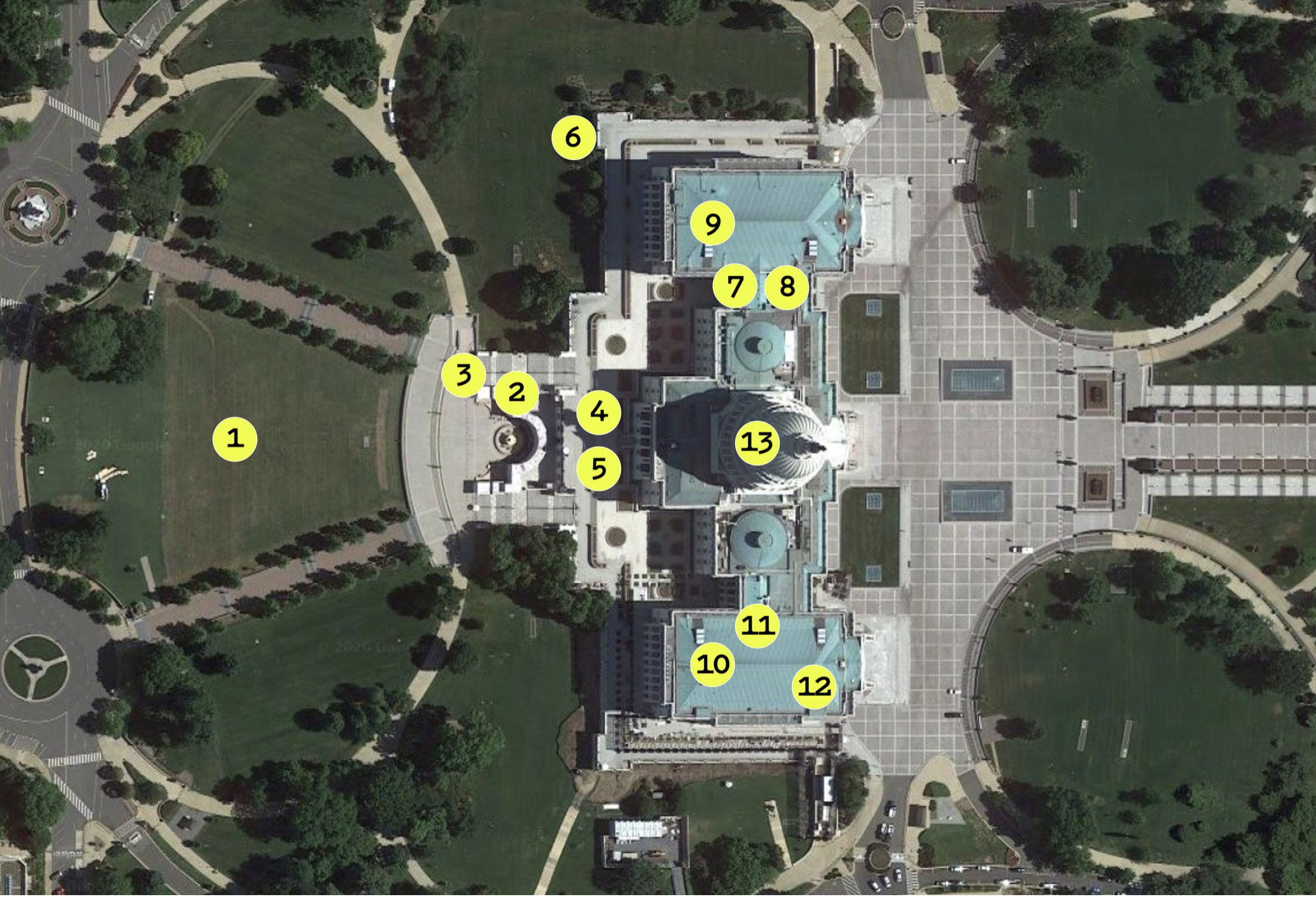 The hopes for surrounding the Capitol, in hopes not to allow any legislators to leave the premises, and indeed to paralyze the government’s regular function, as it prepared to, in the words of the planners of the event, “certify the steal,” led rioters to enter the building from numbers of sights, to overwhelm security by multiple breaches of the building, first from the east, approaching the west front by breaking open doors (5), having scaled rim of the portico (3) as others scaled the walls on the northeast portico (6)–all areas marked “very important” to man–to enter the Senate wing (7). Security was at the same time clustered at the west front (2), as reinforcements were unable to be called. Only after crowds broke into the House chamber and the Speaker’s Gallery did law enforcement officers draw guns, hoping to disperse the rushing rioters at the buildings entrance (4).