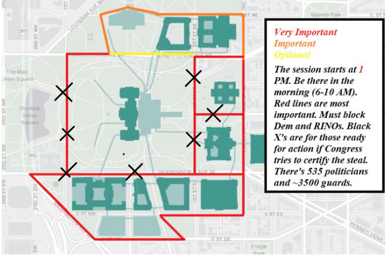 Maps of tunnels available from visitors map circulated as “the most important maps of the day,” the basis to look for anyone fleeing the Capitol, rather than as a point of entry; it was disseminated in color-coded urgency with instructions to form “a TRUE LINE around the Capitol and the tunnels” in conspiratorial tones: