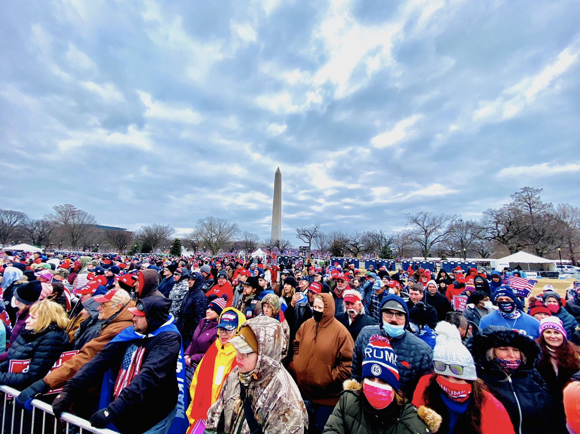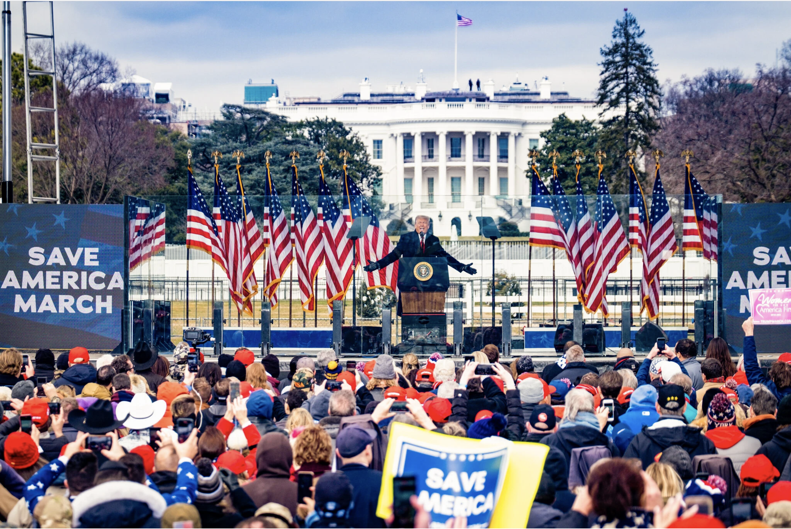 The urgency grew, as the crowd had entered an alternate reality, as the hour continued. Trump bemoaned that “our media is not free” asked them all to turn on your cameras, as “we’re going to walk down to the Capitol,” “that everyone here will soon be marching over to the Capitol building to peacefully and patriotically make your voices heard,” ramping up the energy of the crowd that had been listening to music for hours, thanking his “incredible supporters” as he asked them to refuse all hoaxes, to remember why they had come to the event, how they were all waiting for the Vice President to act as President of the Senate, and join him in demanding “sweeping electoral reforms” and asking them, his soldiers, finally and conclusively to drain the swamp, to restore vital civic traditions of in-person voting, as the representatives and senators who owed their election to him alone would not. Without such a renewal of the Tree of Liberty, the worst would happen, beyond a feared end of liberties: “they want to take down the wall” and “let everyone flow in,” Trump concluded with urgency, imagining the destruction of his long-vaunted project to raise the stakes. Instead, the MAGA minions would “be pouring in to Washington, DC” to restore order and affirm the intensity of their personal relation to the state in a transparent manner that the corrupt tally of the vote obscured.