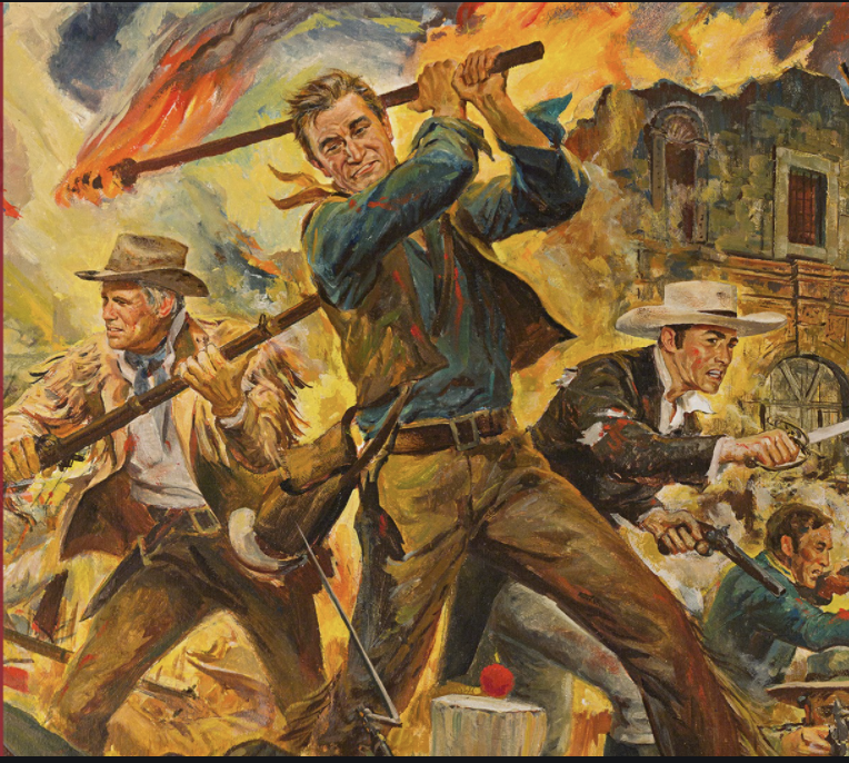 Was Trump especially attracted by the prospect of performing a Presidential role at the site where John Wayne incarnated an appeal? John wayne in his first effort as producer and director sought to replace John Ford as a director, promoting a primal memory of the border–and indeed of the Alamo as a site of border conflict where James Bowie and Davy Crockett faced off at the garrison they had siezed. Their refusal to accpet surrender demanded by General Antonio López de Santa Anna was cast in the film as a battle to the death among white American soldiers and Mexicans, eliding or erasing the Mexican presence in Tejano forces, for a myth of Anglo identity. The role John Wayne famously played was a strongman on the border on the silver screen, who must have remained in Trump’s mind, and defense of the actor of whom he was a “fan” for his avowed sympathy to white supremacists; the large-scale battle sequence in the film set the stage for border heroism, so much that the film shot on-site increased tourist interst in the old fort as a patriotic shrine. The evocation of the heroism at the Alamo, in an attempt to echo John Ford films in which Wayne had starred, promoted the championing of American values to displace the experience of the border, aiming to elevate his own cinematic status beyond Ford’s films in a Technicolor spectacle foregrounding patriotism.