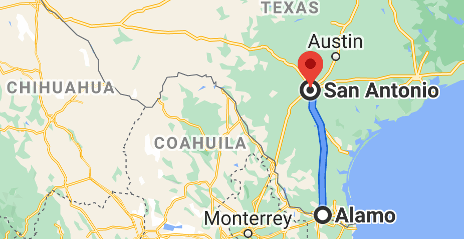 San Antonio was far from the southern border, but as a crucial trading post to the Mexican interior, and trading post, the city where the Alamo lay was a The mythic line for holding ground against the Mexican forces was never drawn by defenders of the garrison at the Mission whose masonite walls afforded a border outpost and fortress; but the line was mythologized in the service of the defense of a longitudinal boundary line, and is commemorated for all visitors to the Alamo, a shrine to revolutionaries as the site of burial of its defenders, marked by a bronze rod inset in paving stones twenty feet before the church’s door, as a line that Texian separatists pledged to defend to the death until they exhausted their supply of canon balls and bullets. The line, even if it does not commemorate an actual place, and was never drawn, has been enlisted in a project of national memory in a celebratory history of the start of “the geopolitical structure of the Americas” and an exclusion of Mexican history and Mexican memory from the map, as it inscribed a myth of belonging to the occupiers of The Alamo, and their defense of a territory which we imagine we vicariously continue: the naming of the city of Alamo at the entrance to the Rio Grande Valley, in Hidalgo County, was named after the shrine of Texan liberty in San Antonio, as it lay just north of the US-Mexico border.