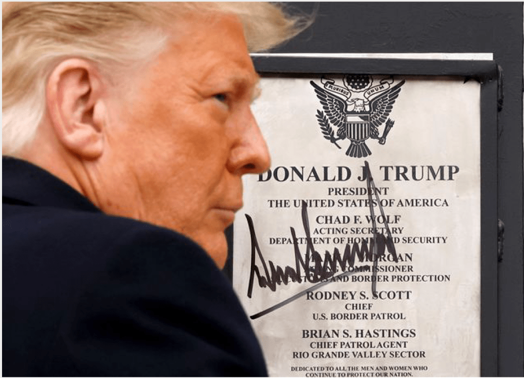 The shiny border plaques affixed as sections of the wall were erected from October 26, 2018–just before Halloween–marked the completion of border wall appeared with the benefit of military funding, as a monument to Trump’s Presidency and of meeting his promise to the nation, in almost a running narrative mimicking the border’s fortification to remind posteriety of Trump’s priorities. By January, 2021, his final border visit was both a reprise before the favored backdrop before which to perform his Presidential role, a final performance of sovereign authority, and a final in a series of attempts to remap the border in the public imaginary of Americans as integral to a vision of American sovereignty and power. If the border wall had been a long process of adjustment to the limits of eminent domain, environmental regulations of sensitive habitat, problems of mixing and moving tons of concrete at great cost to the desert, or local ecology, all wiped away by shiny plaques placed at intervals on the border wall, and now at Alamo, to fix the border wall in a national imaginary.