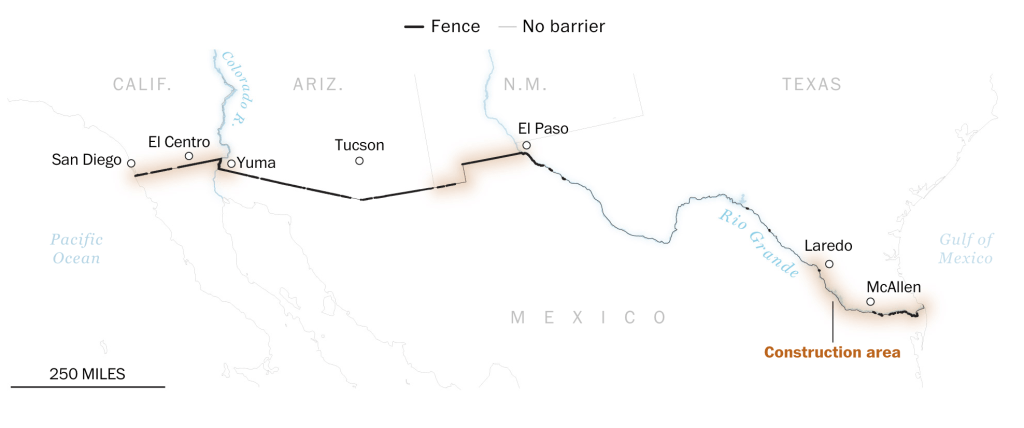 Yet as if to respond to a moment of crisis, and insecurity, in a rage of mass shootings, apparent terrorist attacks, and with the nation almost cracking as a container of social unity, he pledged to restore a memory of order by affirming that strengthening of its border would be a mandate to “Make America Great Again.” If walls have been historically constructed as a basis to patrol entrance and exit from states in the ancient world, as the Sumerian Amorite wall to prevent nomadic migrations, or Hadrian’s Wall that sought to prevent incursions of the Picts: but the historical normalization of Trump’s preposterous project as neo-imperial efforts erases the demonization of the other in cartographies of danger without much to do with territoriality, if they present themselves as defending territorial security. Indeed, the majority of migrants crossing the border, once primarily economic, continuing to aspire to a better life, but increasingly seek asylum. But the bombast of the aims to construct the Border Wall still conceals that the Trump administration has, after four years and the procurement of $15 billion diverted from counternarcotics and military construction projects to build or rebuild a border wall has built but four hundred and fifteen miles, a substantial chunk of concrete, but hardly a dent in the coverage of 1,279 miles of unfenced land, and just under two thousand miles–1,954–of the US-Mexico border.