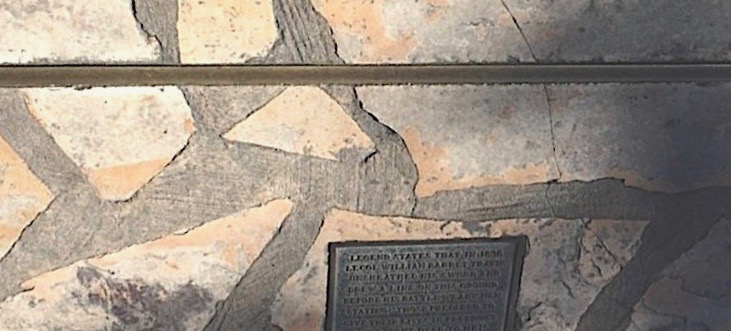 Faulkner reminded us that, in the Southern United States and in the world, “The past is never dead–it’s never past,” the line of defense that has been long venerated as the line of bravery for “battle-weary men” is invoked as mapping an Anglo Texan identity as a clash between heroes of the “Republic of Texas” embodied by Davy Crockett, Bowie, and Travis, set into stone tiles of the old Mission venerated as a shrine to the nation. If the expression echoed the line that the conquistador Francisco Pizzaro allegedly traced in the sand in Peru in 1527, separating the state he would claim from Panama; this classicized colonial imperial gesture seems channeled in Donald Trump’s visit. There is no evidence that the bronze inset visitors to the Alamo line up to see exists line records where Travis ever drew his line, but the line in the Alamo is preserved as a boundary that we celebrate, a point of orientation we use to imagine the place of the Alamo within the national map.