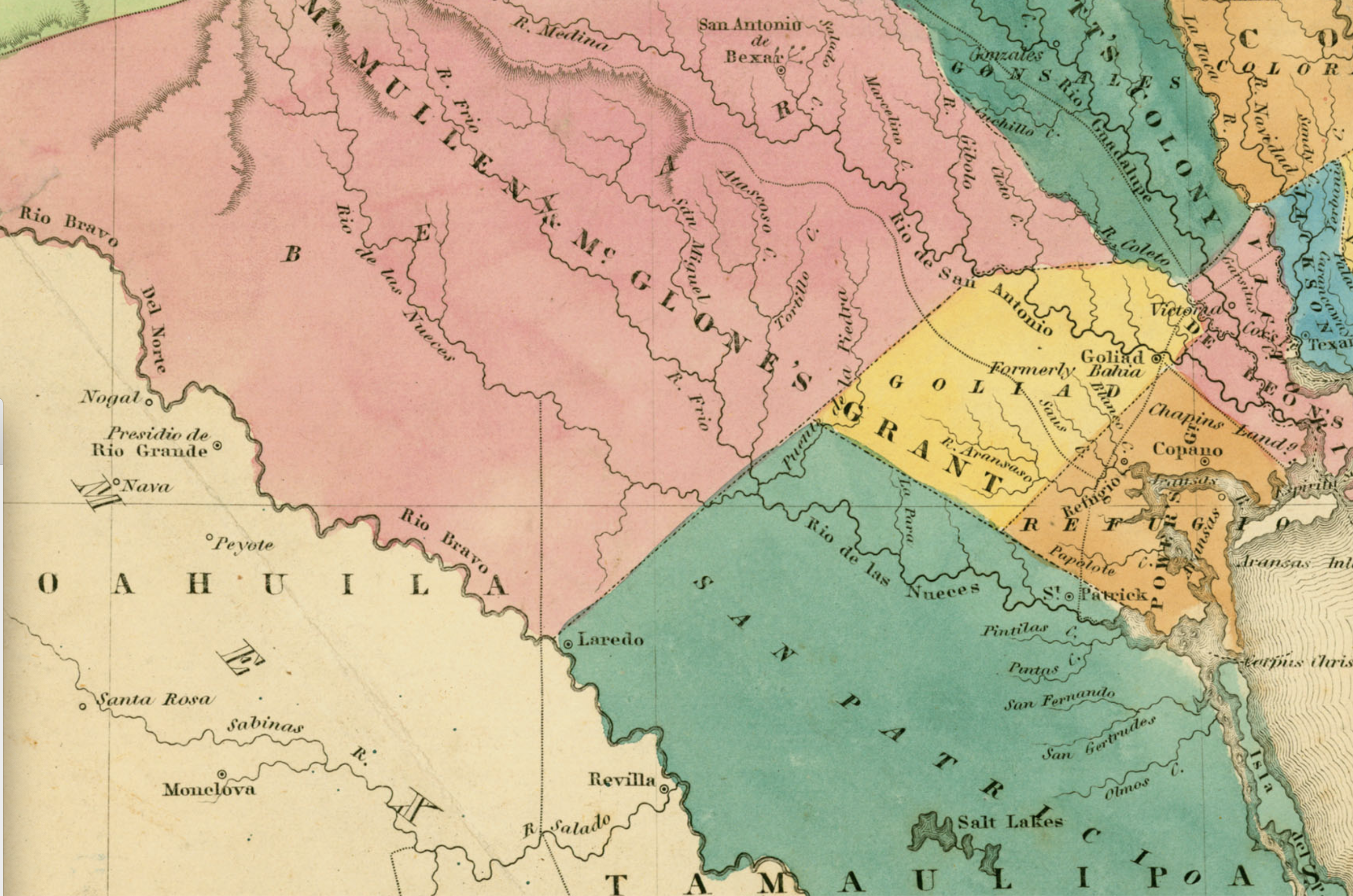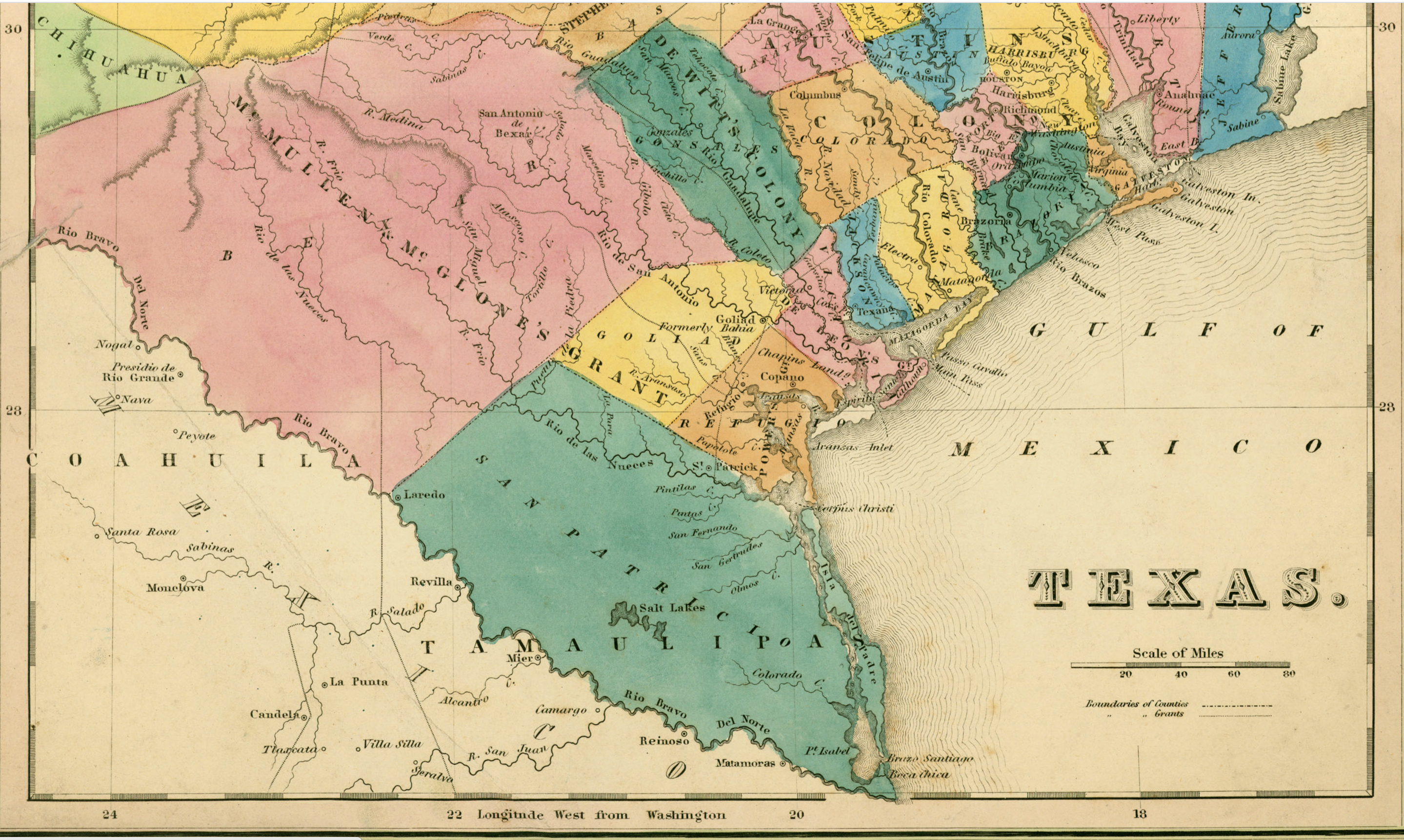 While the defense of the United States’ new southern boundary after the annexation of Texas by Congress, as the military occupation of the territory led Mexico to sever relations with the United States government, the State of Texas was mapped as Anglo land grants above the Rio Grande (or Rio Brava), during the Texas Revolution, against longitude from Washington, DC according to acts of the U.S. Congress, as Texas militia invoked The Alamo decades before the United States’ southern border officially extended to the Rio Grande.