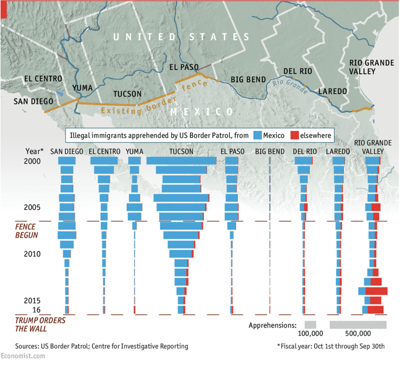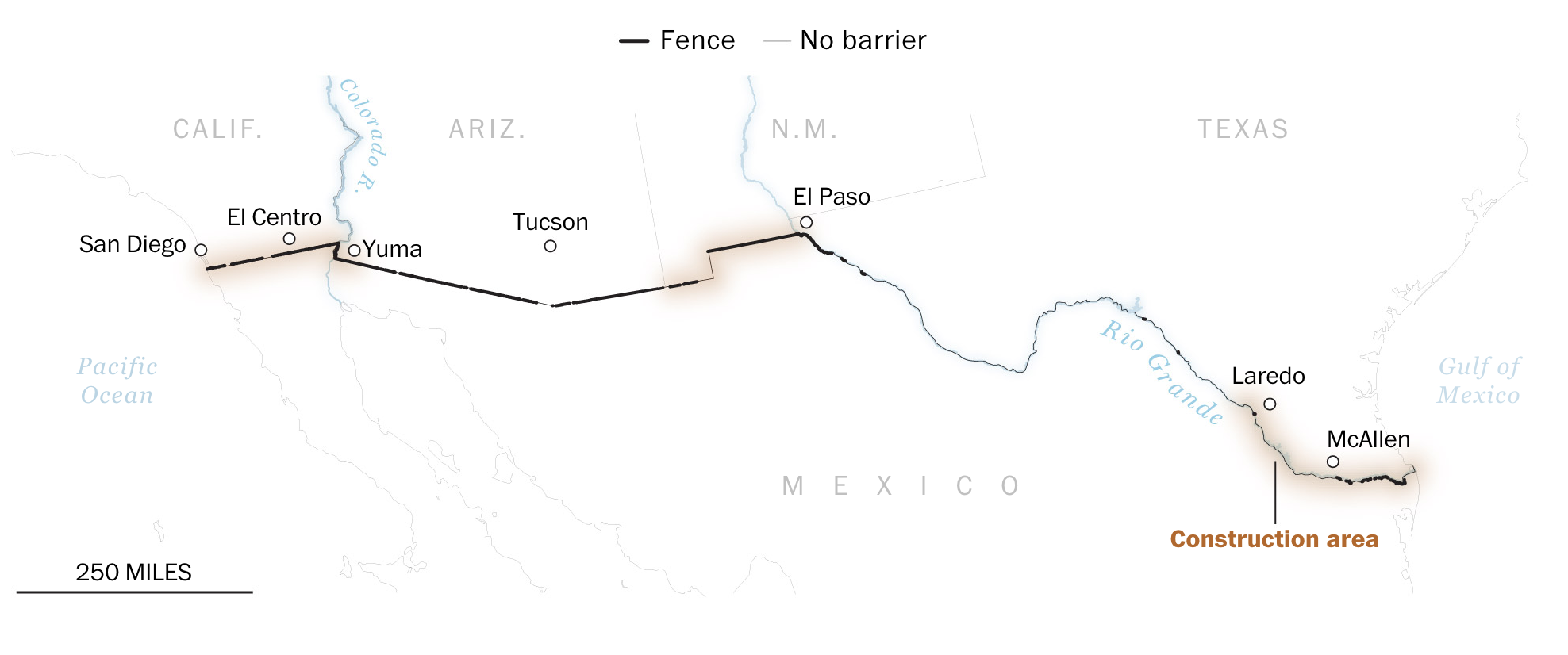 The escalation of costs of the U.S. Border Patrol needed to be defended as a budgetary ballooning on Trump’s watch, as a new administration was about to reprioritize budgetary needs. The pattern of border migration in the late twentieth and early twenty first century have little to do with mass-migration movements, but any perspective on their global character has been diminished by the focus on borders as impermeable barriers. Trump had presented an even more insurmountable wall across a region America long encouraged economic migration for low-paying agrarian jobs was presented as a way of the economy and civil society. He presented the wall as a showman and as a shaman, “securing” a border including 1,279 miles of unfenced land run across rugged terrain, rivers, and desert unsuited to build a continuous concrete barrier, and often across protected lands. But the point of the wall was less practicality than the soundstage it offered to an ambitious man who tied them to his pubic persona more than to their effect, if the genocidal nature of the closure of the border presented the sort of anti-globalist gesture of thumbing his nose at the International order not only isolationist but elevated domestic interests above international law and civil or indeed human rights.