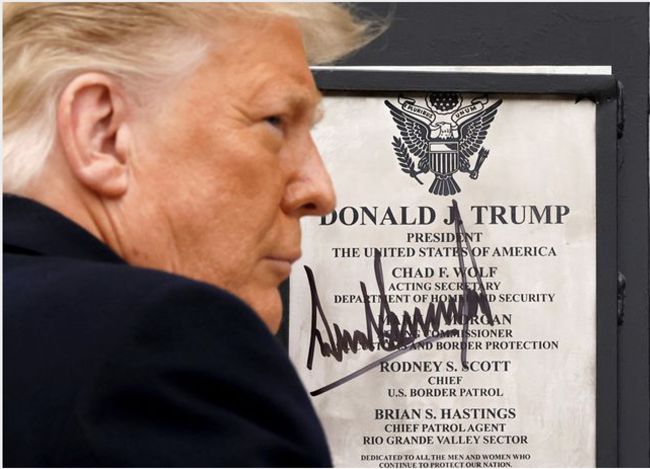Trump’s visit to the border was a final salutation to the very issue that had began Trump’s political career and seemed to be equated with his sense of sovereignty: it was also marking a possible farewell to a vision of an imaginary of the border and of border sovereignty. There is no such thing as a state, as Trump had it, without a border, and the border had been sacralized as a claim to sovereignty in the Trump administration. If the Trump administration had expanded border wall contracts on private land in a Declaration of Taking in the Rio Grande, however, some fourteen incomplete projects of border wall construction left to a Biden administration provided an occasion to affirm a personal promise and pledge to Customs and Border Patrol as if they would be preserved against the specter of illegal population movement that he had painted as a deep danger to national security. While Texas congressman Filemon Vela of Brownsville hoped that Democratic leader Nancy Pelosi would with Senator Schumer “draw a line in the sand and oppose money for even an inch of border wall construction,” Trump rallied a different border imaginary of ‘a line the sand’ in visiting Alamo, a line which he drew with a Sharpie on the Border Plaque, rather than on the Texian sands with a sabre, symbollically affirmed his Presidential authority and identity, as he was leaving office and entering civil society, with little sense of what was ahead.