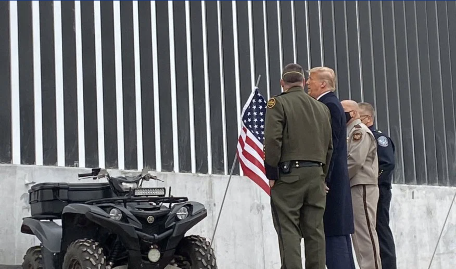 Trump has given unprecedented official legitimacy to U.S. Border Patrol, a once low-level organization without much sheen or status in the federal government, both in enforcing immigration at the border and gaining a large technical armory designed for increased “OpCon.” As if in exchange, Trump has basked in their approval, since the early endorsement of his Presidency. The border wall has been increasingly apparent as a proof his leadership and performance as President, since it was introduced at his early rallies, occasioning a rallying cry triggering “fight or flight” responses. Border wall was featured on social media, in the obsessive redesign of the border wall, and in regular visits to the border wall sections. The 2020 campaign featured Trump ceremonially signed the plaque commemorating the completion of two hundred miles in late June 2020, inspecting its reflective surface after a Phoenix rally celebrated installing border wall to buoy his fortunes in Arizona’s primary, as if looking for evidence of the second term an Arizona victory might bring.