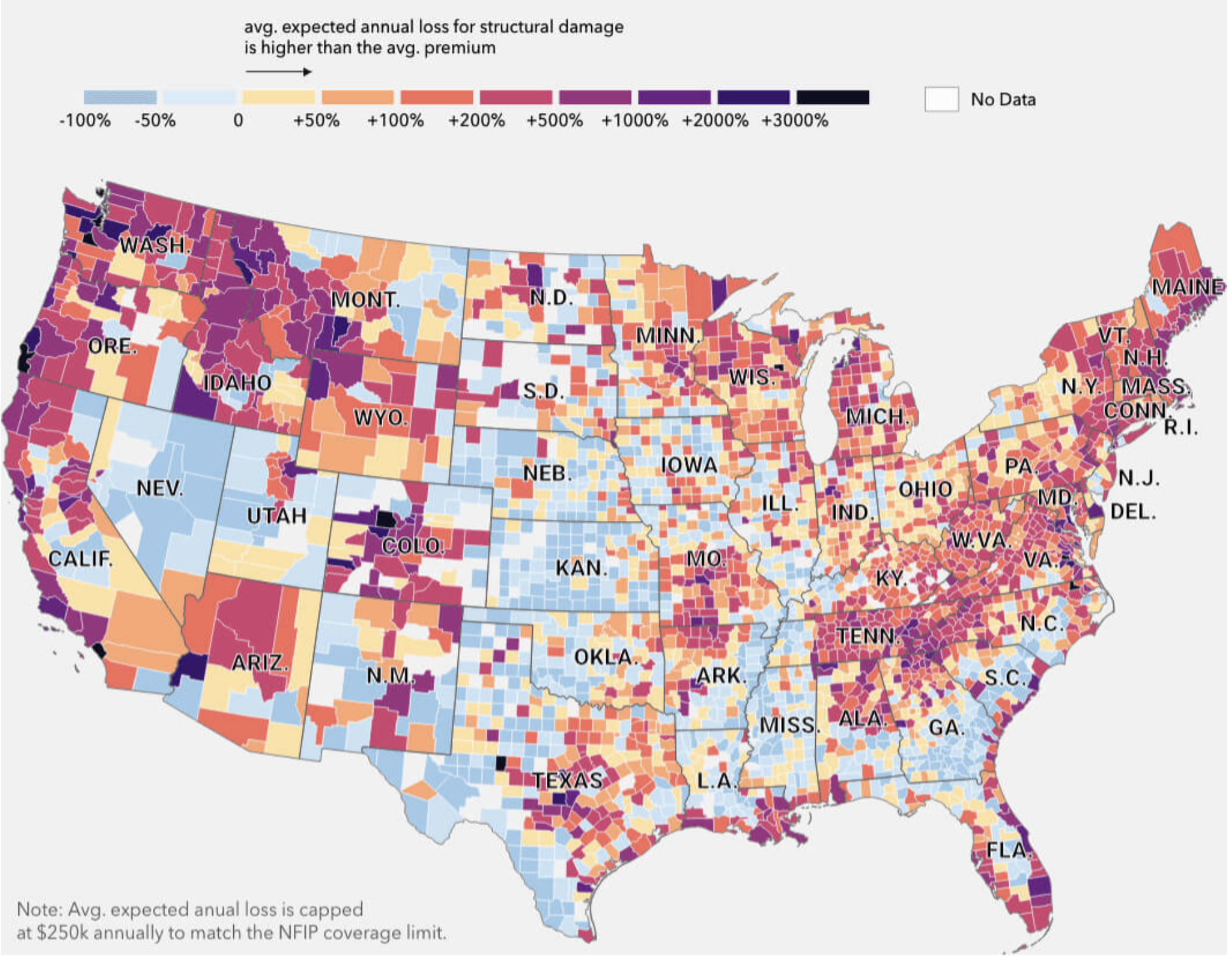 These areas of substantial risk face risks far greater than current insurers, who are effectively acting as ostriches before climate change extremes as polar melting brings further surging seas, and suggests that actual risks far outpace the estimated in premiums on coastal and other property insurance–who have deflated the risks they have effectively denied, First Street found, with help from MapBox and , as estimates of economic losses in coastal areas stand to rise by almost $6,000 per property, a rise in risk of two thirds, projecting a net loss of $34 billion dollars in the contiguous United States, not including Alaska, Hawaii, Guam, American Samoa or Puerto Rico–each of which will stand to be be hit hard. The divergence between computed and actual risk suggest a grim future for some of the most vulnerable and poorer areas of the nation, but a broad underestimation often of 500% in Maine, New Hampshire, Connecticut, Rhode island, Delaware, North Carolina, South Carolina, Florida, Louisiana, and California–real costs that are being passed on to homeowners, which the government has allowed to be concealed diverge by an average of 4.2 times from expected risks of environmental damages due to climate.