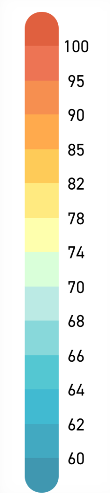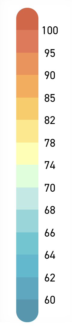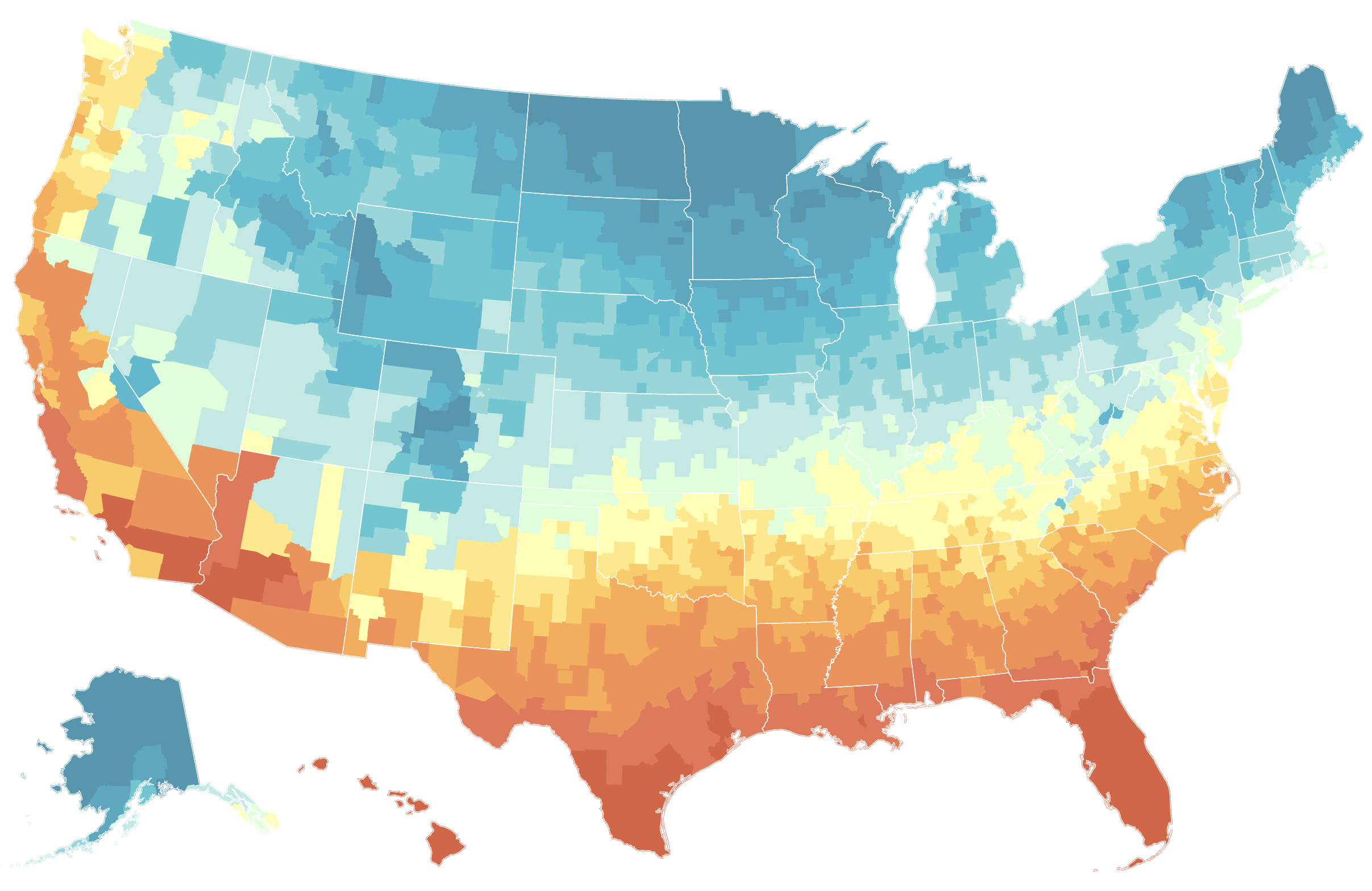 –that, to use the current color ramp, suggests a parched mid-century across much of the southwestern states, with temperature shifting just three degrees above the historical levels, but absolute levels in Texas and Arizona consistently in the eighties in the coming years, rising by mid-century to high eighties.