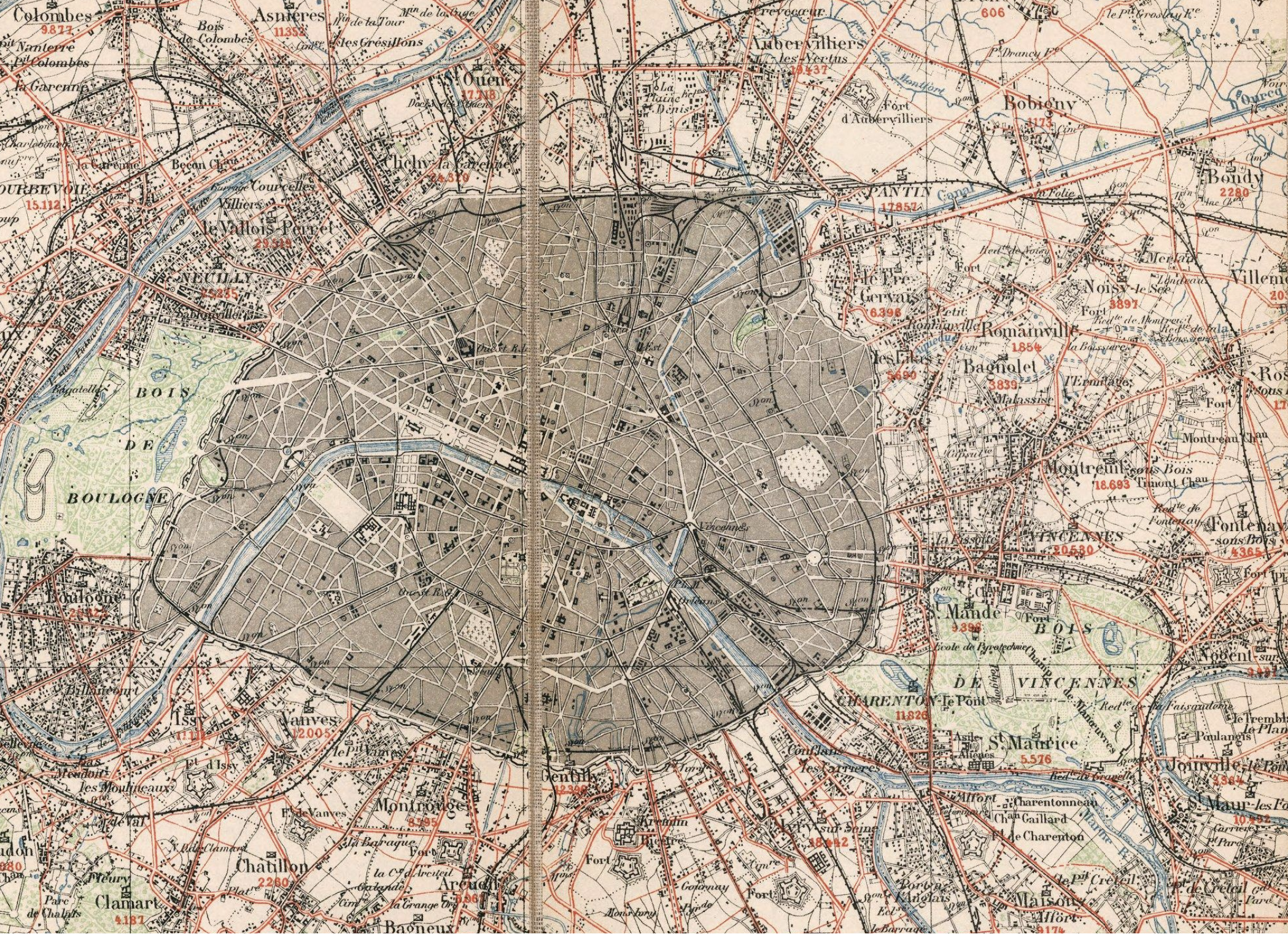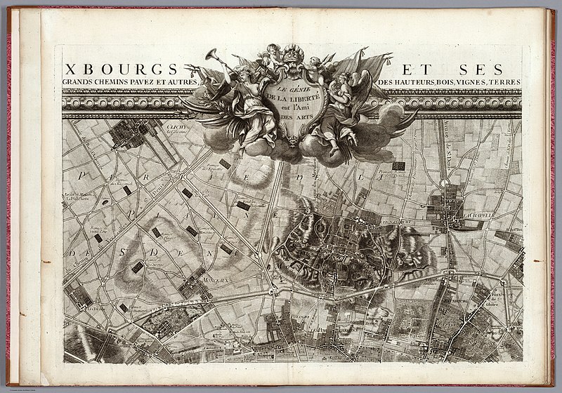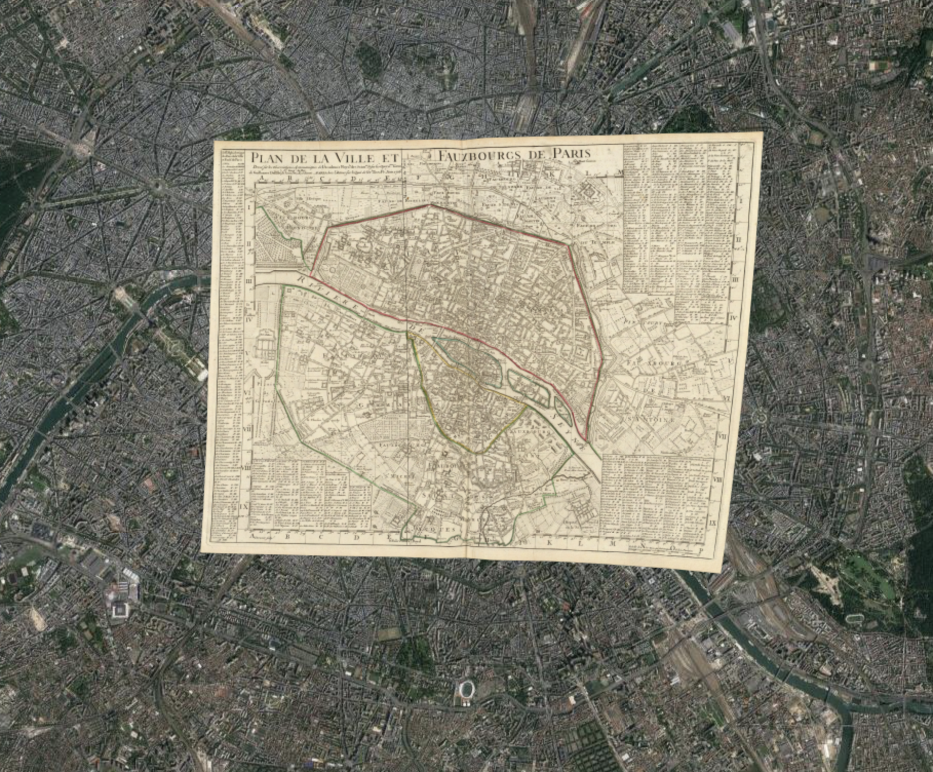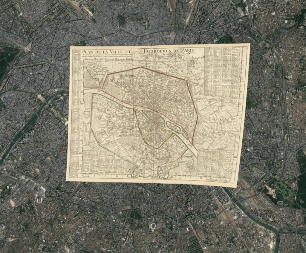 The increased constriction of cerulean skies by the railroad was something like a tipping point, we sense, of the industrialization not only of Paris, but of all France. The growth of railroad tracks were a shift in spaced that akin to the “Hausmannization” of city streets that realized a program of street-broadening and repaving to permit cars to navigate with ease in the 1860s, and indeed circumscribing the possibility of wandering by undermining the spaces for pedestrian walking of the old city; critics of modernity in Berlin or Paris argued the grand boulevards might rewrite the individual’s relation to public space, with the premium they place on driving, more than walking, and on speed, built across the agrarian environments they often now provide a romanticized way of viewing. The railroad tracks leave an imprint of their traces on the expanded metropole whose expanse contrasts sharply to the 1716 map David Rumsey Historical Map Collections digitized and reprojected over a current built urban expanse in its own copious geogarage.