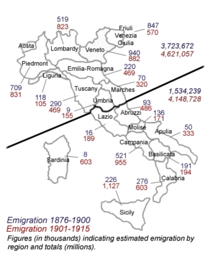 While the outmigration of Italians after unification were mostly to the Americas, the practice of unification–and transferral of concentrations of wealth and capital from Palermo and Naples, largely in the form of gold deposits in Naples to Turin and then to Rome, created a marked acceleration of migration from both Sicily, Calabria, and Campania after 1900–can one really associate the growth of American pizza to this massive transatlantic transfer of population?