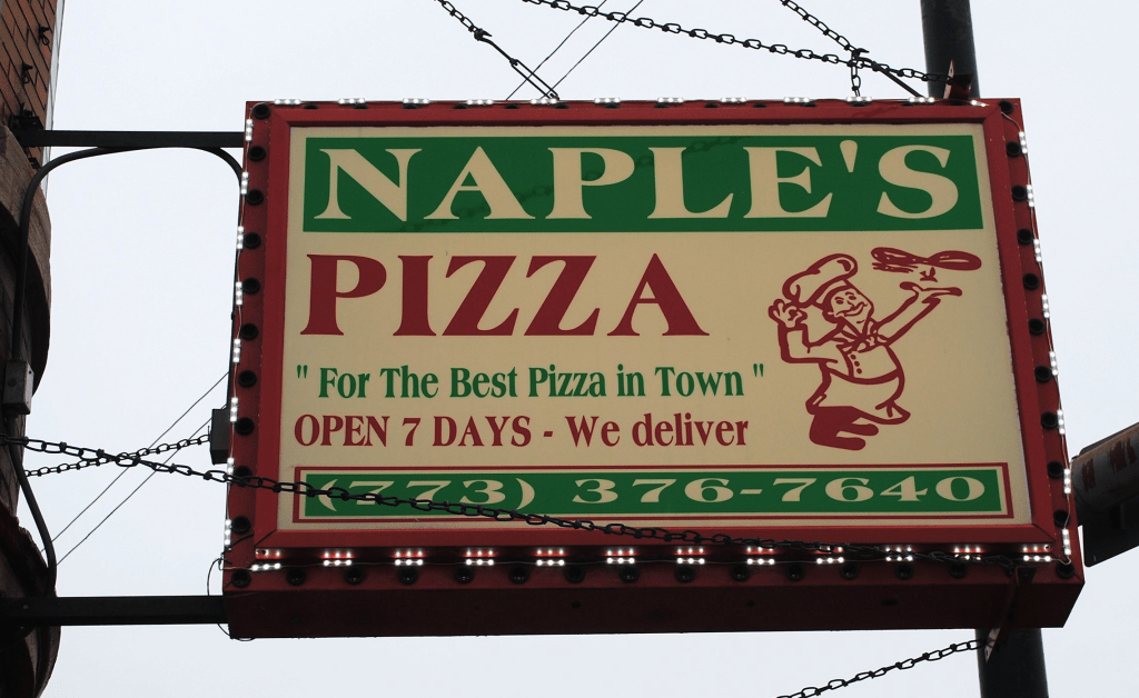 The populism of the pizza still exploited the idea of bonds of social cohesion in simple pleasure, crossing age lines and and even lines of class. There was something quaint in transforming the Italian-American tradition of pizza-making, baked in huge gas ovens worth the initial outlay to turn a heft profit margin with the promise of ready delivery, far from Naples; in Chicago, far from Italian geography save in a romantic identity, captured by the the shop’s tricolor shingle. Was the glue only of shredded mozzarella, or was it in the open indulgence of consuming a pie whose chewiness by freshly spun dough provided a satisfying informal fare at all hours of day? The frequent identification of the southern provenance of pizza making in towns as Chicago suggest a native food, hardly linked to its old place name.
