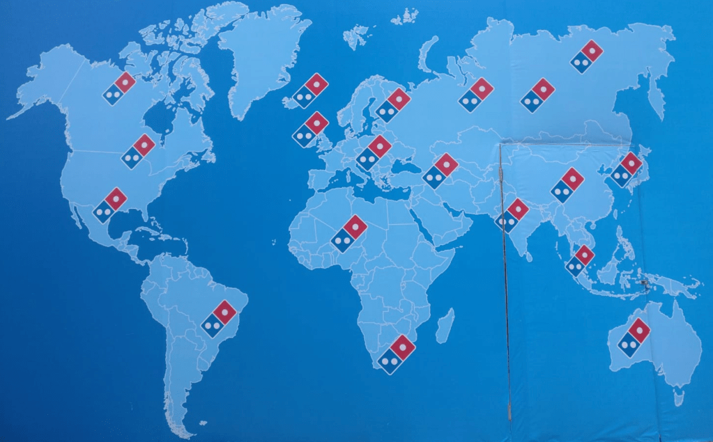 Perhaps the map was preaching global satisfaction in an easily prepared food, If Dominos posted a bad map to trump the opening of their two hundredth store in mainland China–and 10,000th globally–maybe that was the point. The poor projection the multinational chose lacked clear correlation to a base-map and readily sacrifices global curvature or cartographic iconography to a flat earth blanketed by logos, whose color scheme echoes its corporate palette and asks the viewer recognize an image of global dominance. Without bothering to chart locations of stores, it boosts the “global growth momentum [generated] by opening new stores every day . . . bringing the best carry-out and delivery experience.” So preened the Executive Vice-President of Domino’s International in an unabashed display of unchecked corporate pride, far less concerned with a relation to space, than an ubiquity of brand, treating the superceeding of place as a corporate milestone.