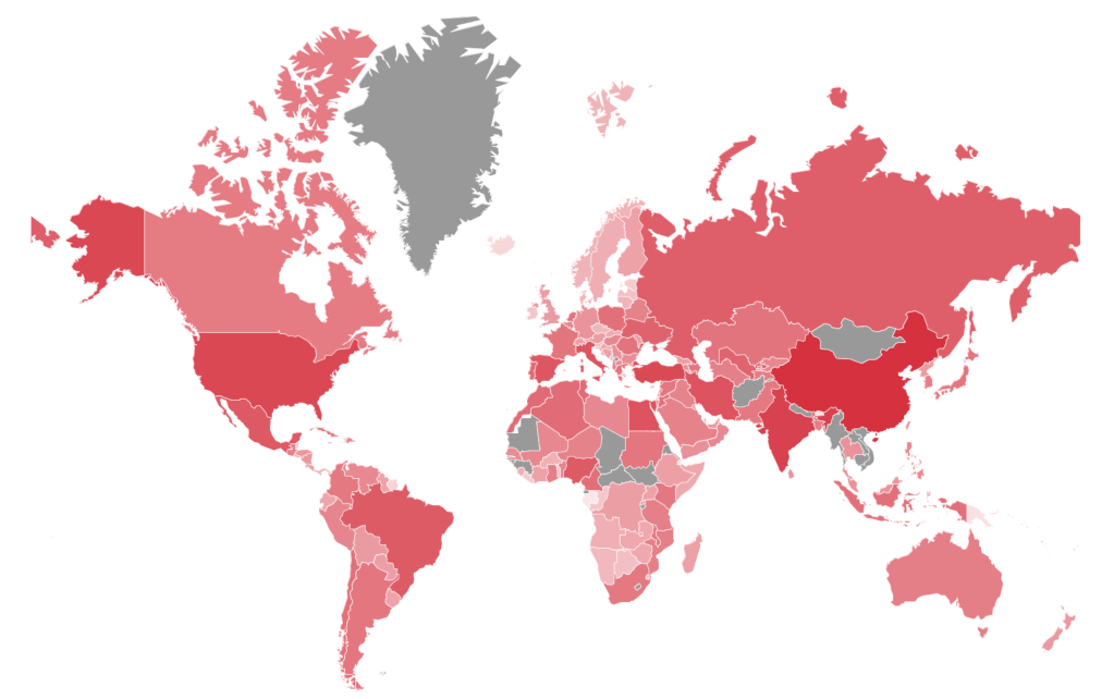 As much processed cheese distanced pizza-making from sourcing agricultural products, the once-local cultivation of the tomato has became global–China’s 60 million tons annually to vie with Italy in tomato production, with Turkey (12 million) and Brazil (4 million) far behind–if Italy continues to dominate tomato derivatives and processed tomatoes–in an atlas of Global Tomato Production of 2020, whose shades of red suggest looking at the world map with a color ramp of tomato juice–