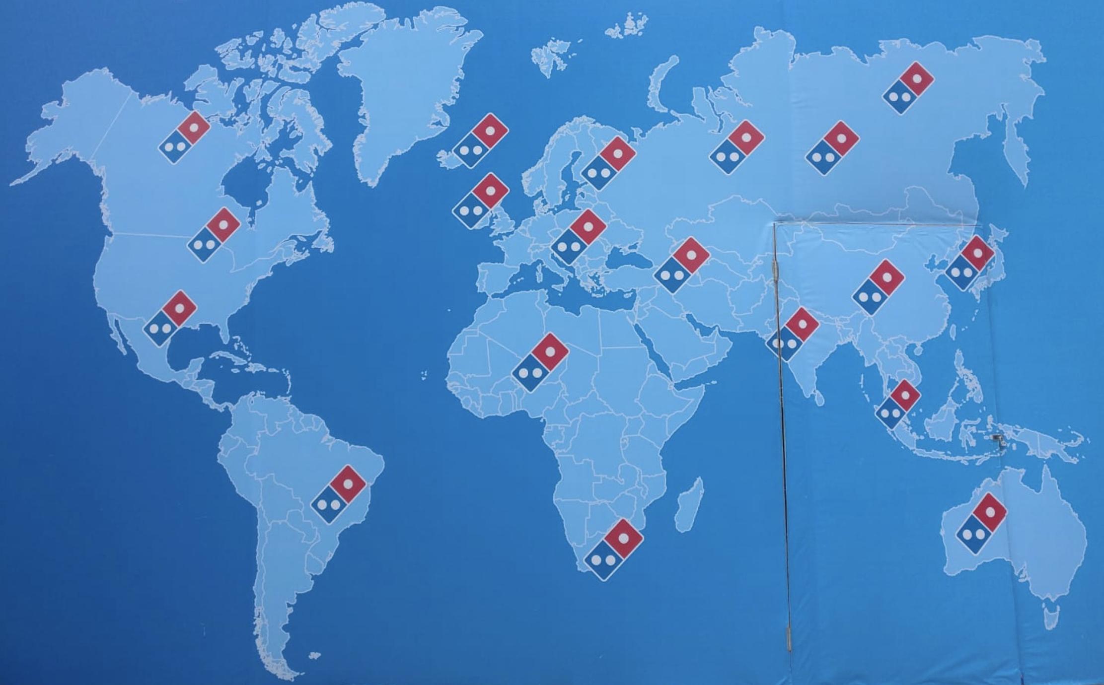 Perhaps the map was preaching global satisfaction in an easily prepared food, If Dominos posted a bad map to trump the opening of their two hundredth store in mainland China–and 10,000th globally–maybe that was the point. The poor projection the multinational chose lacked clear correlation to a base-map and readily sacrifices global curvature or cartographic iconography to a flat earth blanketed by logos, whose color scheme echoes its corporate palette and asks the viewer recognize an image of global dominance. Without bothering to chart locations of stores, it boosts the “global growth momentum [generated] by opening new stores every day . . . bringing the best carry-out and delivery experience.” So preened the Executive Vice-President of Domino’s International in an unabashed display of unchecked corporate pride, far less concerned with a relation to space, than an ubiquity of brand, treating the superceeding of place as a corporate milestone.