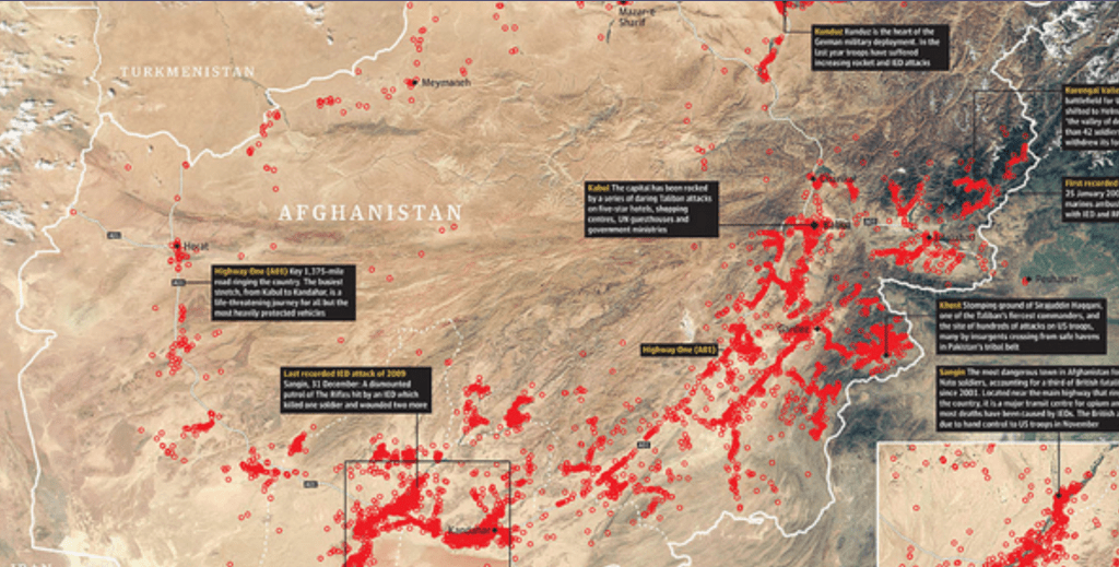 The narrative of Taliban advance is however mapped as an optic of loss. But the loss is almost hidden from visibility in the very same maps. The failure to compel Afghanistan to present Osama bin Laden and Taliban officers or training camps created the false sense of security of a show of power. It was based on and predicated the false concept of a submission of Afghanistan as best achieved by bloody bombing campaigns, drone strikes, and military incursions. For the loss of what we imagine territory held by our troops seems almost to cleanse the bloodiness of that past history. The advance of the Taliban into areas that were allegedly once in “government control”–or are labeled as such–reveal the spread of an ominous wash of deep crimson across the country as the tragic end of the War on Terror, something of a blood bath in the making, a spurt of pink and deep crimson red–as if the bloodshed was not cast by an American show of power.