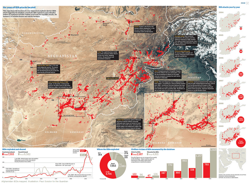 These graphic visualizations are hardly accurate maps, but conveniently omit all information about the “sharp end” of battle, falling back on the geostrategic place of “control” over provinces–is this by the flags flying in their capitals? what is control in a war-torn area?–that can be understood as an element of a “Global War on Terror,” rather than the ways that the war was fought. As uncomfortable as such images might be, we prefer the “objective” GPS image “mapping” control, not pausing to ask what they miss or distort, or process the war in an episode on the War on Terror, or a lost field of battle for Afghan independence which it has long ceased to be.