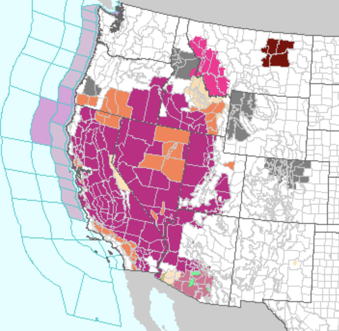 We have come so far from drainage basis in an area of excessive heat that the lack of soil moisture and low level of water that reaches rivers may consign the irrigation schemes tied to the interstate compacts of the Hoover Dam to the dustbin of history. Can the very fact of lack of proximity serve to mask the ignorance of the scope of the declining water-flow from the very upper drainage basin of the Colorado, from which the river draws an estimated 90% of its flow. Has the magic trick of reallocation inherited in the interstate compact promoted a geography of ignorance, by recasting water rights as a “right”–in a misguided belief this would make states stake holders, even while promoting a false story of inexhaustible bounty of water flow? While Powell rhapsodized the manner that the Colorado River, which he explored as it ran through the Grand Canyon and canyonlands, as running south to empty its contents “as turbid flows into the Gulf of California” in 1895, now no longer runs to the sea. The expansion of regional “excessive heat warnings” suggest local weather systems driven by fires pushing northwest as a region into new chromatic registers of triple-digit levels of heat.