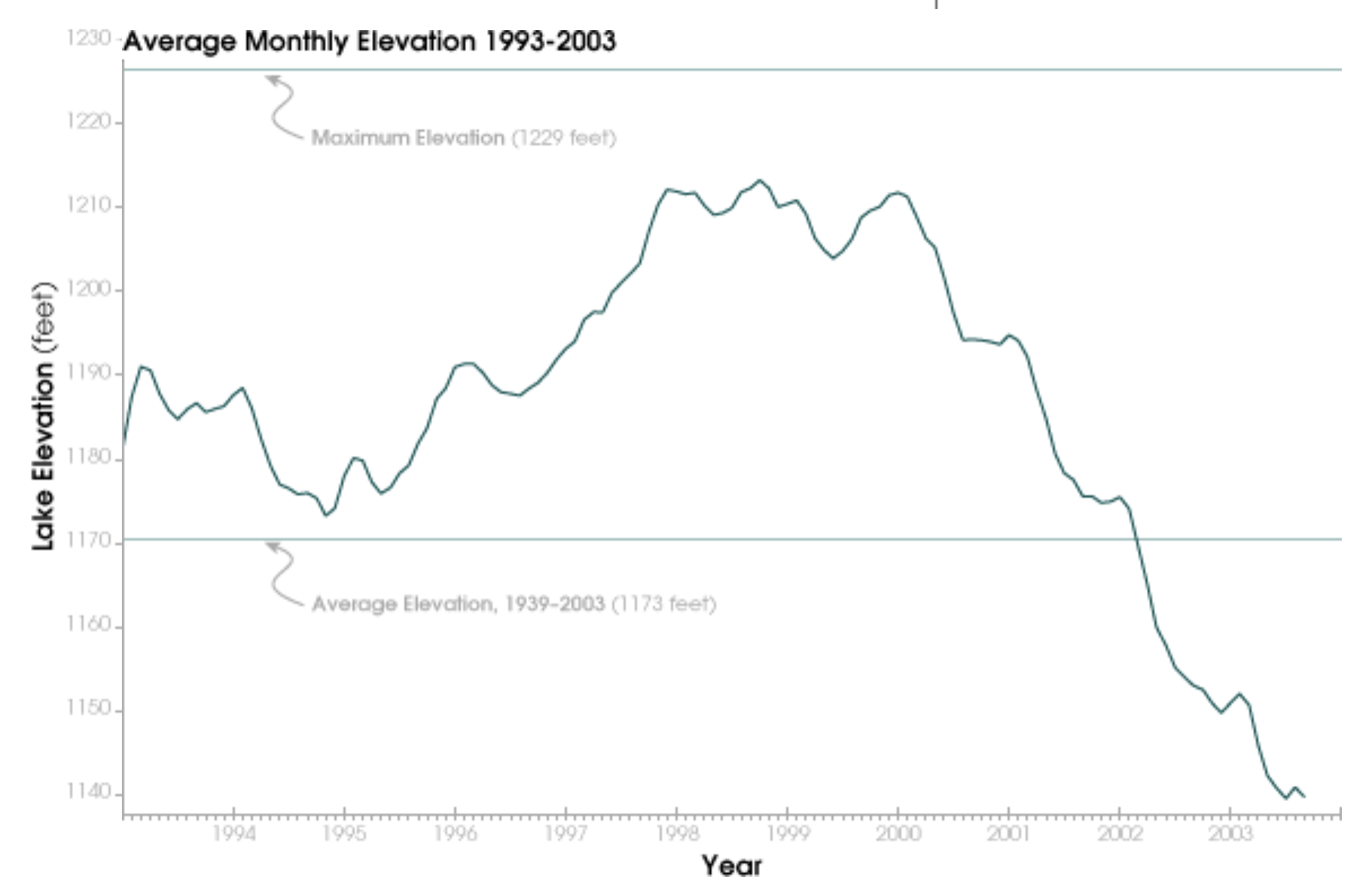 Already during the decade before 2003, the water-level of Lake Mead had declined precipitously, if not far more precipitously than the two earlier declines in its water-levels from the mid-1950’s and mid-1960’s. The decline continued as a plunge below average lake elevation of 1173 feet, by about 2003, in ways that should have sent alarms across the west, were we not consumed by a war against terror, and the attack on global warming by the Bush administration grew, questioning the science of global warming and the dangers of increasing aridity.