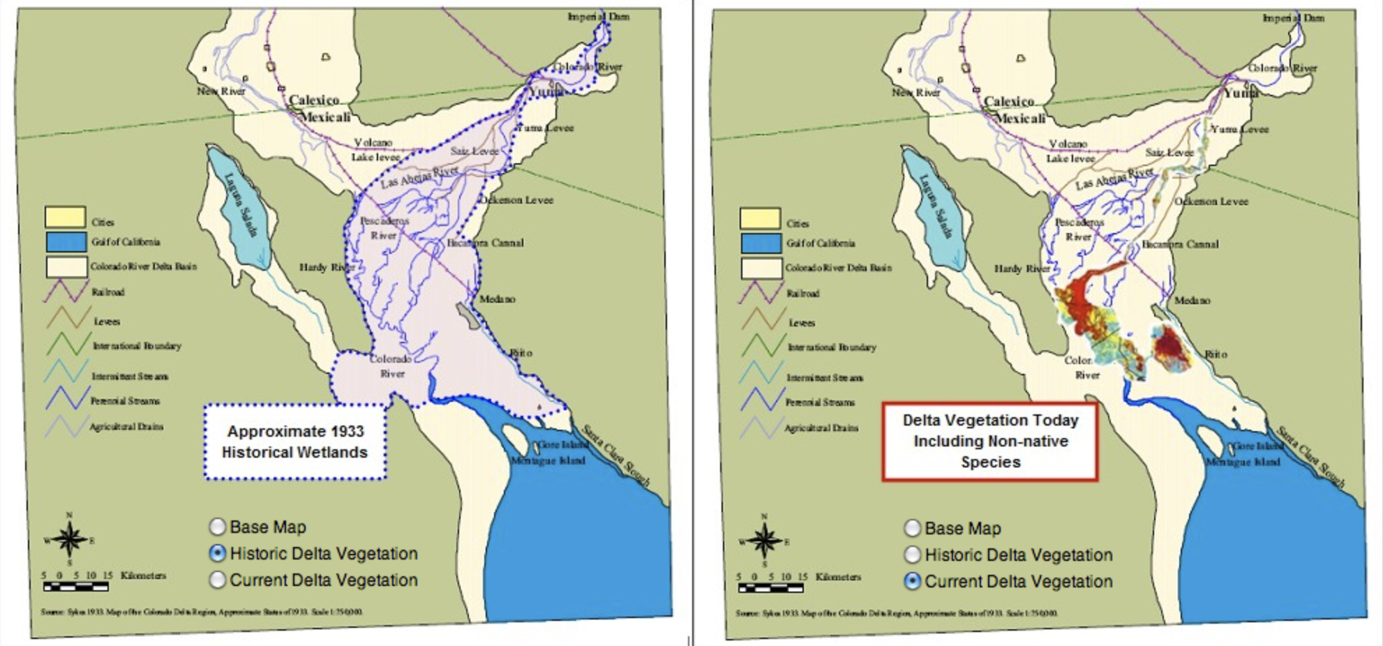 The deep national interests of economic protection that the nation has always held might be traced to the very projects of the redistribution of water rights for flow that has long run into its delta and the once rich coastal ocean of the Gulf of California, a riparian ecosystem once nearly two million acres, was as radically transformed as the hydrology of the United States by the diversion of the Colorado’s waters that reduced and ended the flow of silt and nutrients for fish and mammalian life. If Mexico has protected the 2.3 million acres of water and land around the delta to be an environmental reserve–Reserva de la Biosfera del Alto Golfo de California y Delta del Rio Colorado–and set aside just under a fifth of the region–400,000 acres–for environmental research, and low impact ecotourism and aquaculture, the transformation of limiting water flows into the Delta by 75%, cutting the annual average of 16.7 million acre-feet (1896- 1921) to four, have reshaped the coastal ocean in ways difficult if not impossible to map in two dimensions.
