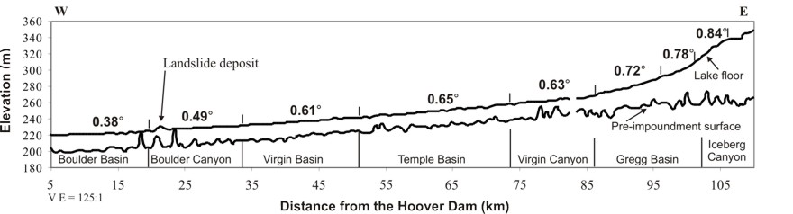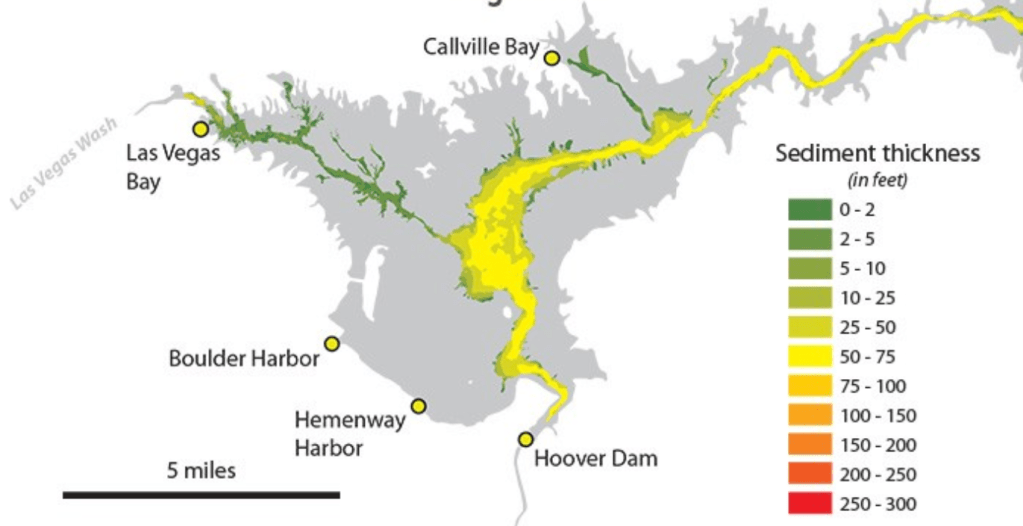 As Lake Mead shrinks, fears of a long unimaginable loss of water diverted from to western states seem a second chapter in the curtailment of the river. For the creation of the reservoir by the Hoover Dam long blocked sediment flow that the Colorado long ago transported south, into the Gulf of California and the coastal ocean that forms part of the territorial waters of Mexico. The Lake was almost primed become a deposit of sediment soon after 1935, when after thirty years alone, the Colorado River filled Lake Mead it began to fill with fine silt and sand from the Colorado River’s sediment load. Only the creation of a second dam in a network upstream in 1963 reduced the silt entering the lakebed to a tenth of its load, eliminating 90% of sediment in a significant reduction of sedimentation that also indicates the extent of sediment carried in the river as it runs south. (The construction of the Glen Canyon captures about 30K dump trucks of sand and sediment a day, or 100,000,000 tons annually, removing millions of tons of sediment that would have been sent south in river flow in the last sixty years and saving it from filling the lakebed of the reservoir and reducing its capacity, feared to disappear in two hundred years.)
