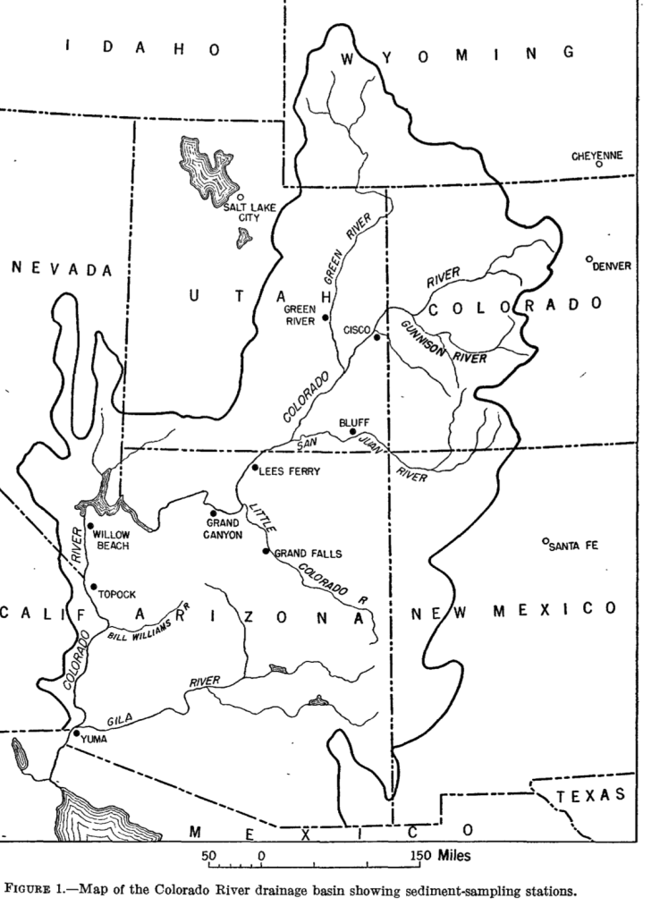 The modernist monstrosity of the Hoover Dam had reduced a maximum flow of half a million tons–according to USGS sampling stations of the 1920s–and presented a new map of past mega-project celebrated in US history in the context of environmental plunder, undercutting how the United States Geographic Society had presented this in encomiastic terms. The USGS surveyor had effectively tabulated the range of sediment the Colorado carried sought from Lake Mead, along the mighty Colorado, as if to register the impact on the river of the dams opened on the Colorado River from the Hoover Dam (1936), a river ably navigated by Powell and others in the second opening of the American West by and the claiming of Mexican lands by imagining massive projects of irrigation. C.S. Howard compiled from available USGS data of suspended sediment in the River through 1941. The sampling stations of sediment-levels of water below Lake Mead before the dams served as the prompt and basis of remapping the river, across the Upper Basin and Lower Basin of the Colorado down to Yuma AZ, and invite readers to imagine the Basin as transcending boundary lines of states, and indeed nations, by orienting them to the obstruction of sediment flow southward that the system of diversion created. Howard’s early USGS map of the River Basin from the 1940s’s stressed the borders among states which divided the vast bulk of the mighty river’s waters, the migration of water and of enriching sediment in the basin itself trumped boundary lines–in ways that has only gained increased poignancy as the waters and watersheds of the Colorado begin to dry: