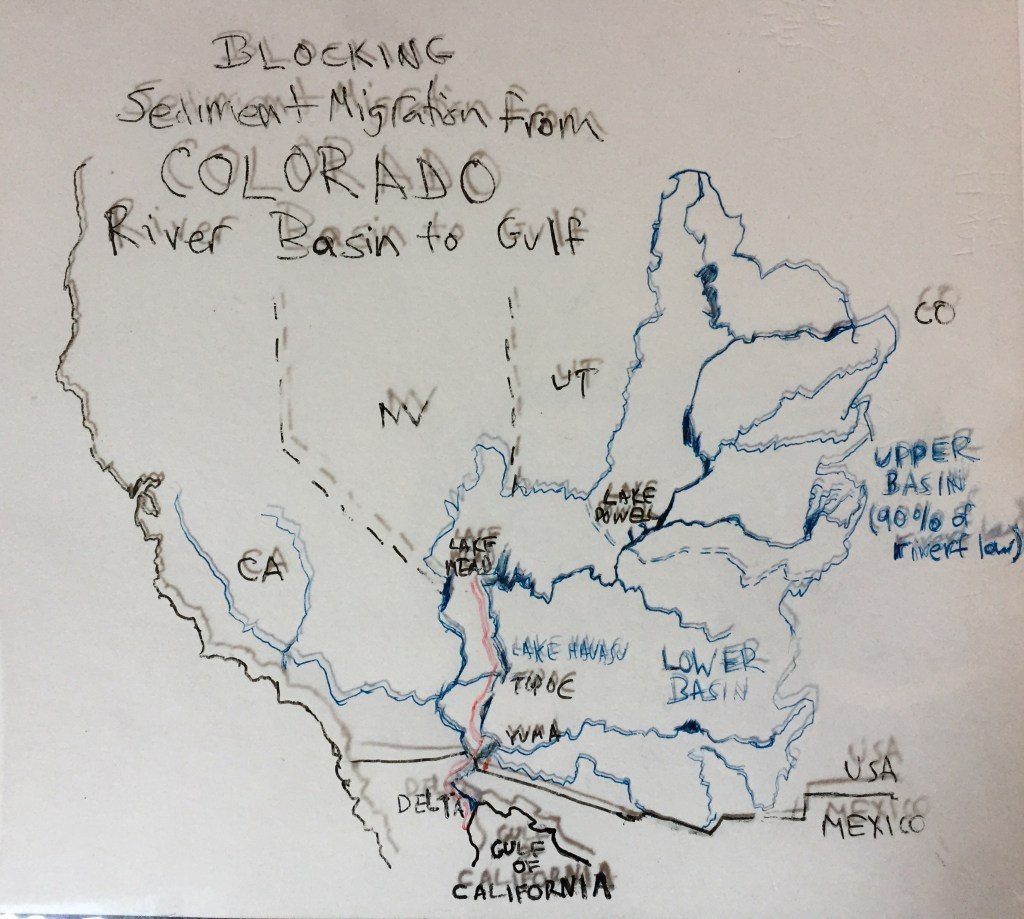 While my own map was not based on a national dataset, but rather the tracing of the range from which the watershed collected sediment from its Upper and Lower Basin, the map asked readers to juxtapose the drainage basin–the very unit by which Powell had urged the government and Bureau of Land Management to parse western geography–and the states that currently derive water from the Colorado as it drains from Lake Mead. Instead of foregrounding the diversion and redirection of water, the transparency I drew from early twentieth century maps that provided a “base map” or template for my hand-drawn version tired to foreground reduced level of sediment in the river water that drains south, and now reaches the coast only several days a year. I sought to emphasize the integrity of the blue network of the Colorado lying across extensive watersheds of its Upper and Lower Basins, across the territorial lines of the states which divided water flow apportioned from the dammed Colorado. Over the twentieth century, a series of treaties that reduced water-rights of Mexico, and with it sediment migration to the Gulf of California. While the temporary restoration of flow of the river’s water had, in 2014, allowed the river for first time in many years to reach the sea–by opening dams to release an artificial “pulse flow” to the Colorado’s former delta as part of a project of landscape restoration of the Delta, engineering a temporary restoration of flow of over 100,000 acre feet of river water to the parched delta habitat and sandy channels, I hoped a transparency might map the dramatic shift in riverine habitat that the Hoover Dam had constructed over the land that changed its character.