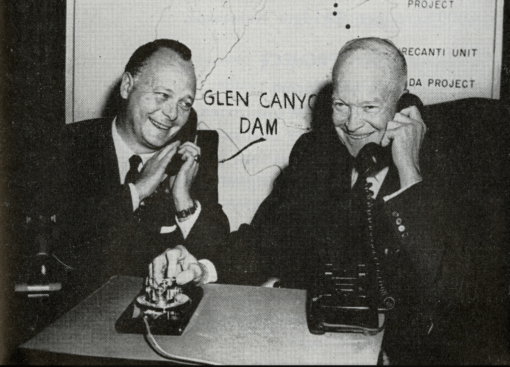 –of the sort that the Highway System offered long ago, and would exist as a similar event enabling a great leap forward in our national economy and national productivity, which were indeed achieved by the highway infrastructure, although the Border Wall offers no similar infrastructural significance. The comparison suggests a short of shell-game, howver, as much as a sort of grandiosity. While Trump evokes Eisenhower as a model for his Border Wall, was Eisenhower’s promotion of a process of dam-building, by the triggering of explosions for the construction of the Glen Canyon Dam in the Upper Colorado, not a better model for his resculpting of national lands, creating the very dam mapped behind him?