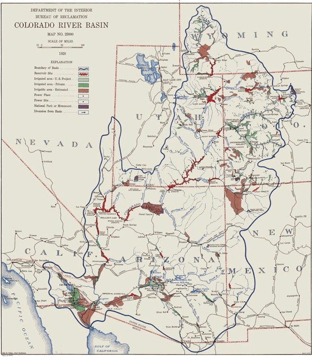 For blockage of the transit of sediment had suddenly transformed the Gulf of California in the early twentieth century from one of the most fertile habitats and areas of settlement of marine ecology, a coastal ocean featuring a wealth of multiple marine habitats, distinct in the globe, the massive reduction or indeed constriction of sediment flow as a national right–or in the guise of national needs–the Bureau of Land Reclamation redefined cross-border relations, in 1928, setting the basis for as much as the partitioning of the electricity and dammed-up water of the Colorado that in 1928 removed almost all of the river’s irrigation from Mexican territory, redirecting “more than 100,000 acres of irrigable land not yet irrigated” in the Imperial Valley, and the irrigable potential of New Mexico.
