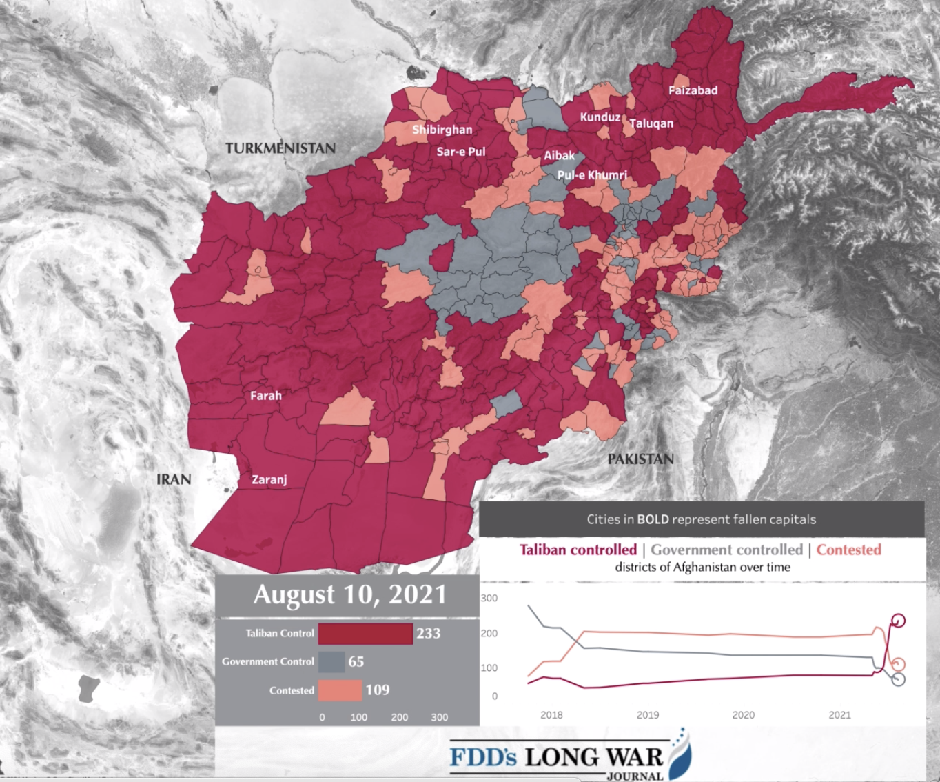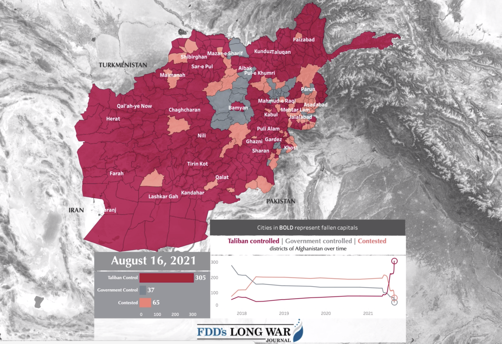5. The animated map in the header to this post focusses on districts, as if provincial divisions might conjure the lost dream of an Islamic Republic of Afghanistan. The state-like boundaries by which Afghanistan is mapped conceal the absence of roads, networks of food, or economic infrastructure within a country that has been pounded for many years by aerial bombing and IEDs. If the falling of districts may seem to anticipate the effects of the withdrawal of “American” forces–ending in the sudden shift of thirty-two of thirty-four provinces to the Taliban, charting an offensive success as a spectacular “failure in leadership, intel and the military,” the absence of infrastructure has been a result of the insistence If the centrality of the timing of an American withdrawal to the anniversary of 9/11 is notable, as the date provided an occasion for Trump to invite the Taliban leadership to Camp David in 2019, and a date for the finalization of the troops’ withdrawal, it nay have gone far less noted that the visualizations of “Government” and “Taliban” control in Afghanistan’s districts derived from visualizations promoted by the Foundation of the Defense of Democracy (FDD), founded months after 9/11 to strengthen national security in ways that understood the world in black-and-white terms as an opposition of “Good” and “Bad” guys to clarify the lay of the land by the optic of global geopolitics in which “Afghanistan” has come to assume so central a role.