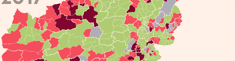 The absence of attention to the situation in the ground is nowhere more apparent than in the GIF that is the header to this post, which reveals the “fall” of Afghan districts to the Taliban from April, 2021. We map the hasty conclusion of the long war in GIF’s of districts, as in the header of this post, the flattening of a country that has been divided for over forty years, a form provided by the Long War Blog. The division of inhabitants of the land, or the effects of previous combat on the nation’s infrastructure and sense of security, is hardly rendered in the shape-files that flip from one hue to the other, suggesting a “lightning” advance of a militarized Taliban, evoking a sudden loss of a territorial advantage for which Americans long fought, and for which Aghans are to blame. Yet as much as the linked maps of “district control” suggest a traumatic collapse of the Islamic Republic of Afghanistan, the ally of the past five American Presidents, the maps collapse or elide the deep disturbances the war and importation of arms has brought to the territory that lies beneath the map, or oversimplified visualization of regional control.