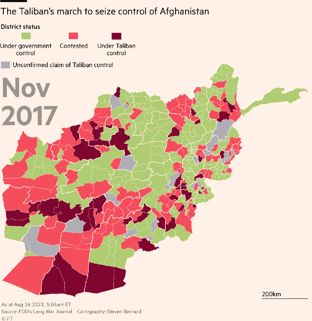 To be sure, the advance of Taliban was not how we wanted to imagine it as a restoration of “normalcy” or a status quo, and a rejection of a theocratic government for a secular liberal ideal. But perhaps the image of Afghanistan as a liberal state was indeed a failed project, and it only existed in maps that had outlived their usefulness or reflection of the area on the ground. The “fall” of Afghanistan reflects the inability to contain the Taliban from the nation, and the weird blindness that America–and the American military and perhaps military intelligence–have to the effects of war on Afghanistan on the ground, wanting to believe in a clear chain of command, recognizable in other militaries, in the AFSN. The GIF seems to raise as many questions as it resolves of the fall of Afghanistan’s provinces to imagine what that ending looks like. As much as the number of districts that speedily negotiated a resolution of hostilities with the Taliban, the fall of Afghanistan and painful and deadly withdrawal from Kabul has been cast as the final cataclysmic episode of the War on Terror, as if President Joseph R. Biden–and Donald Trump before him–had already decided on a military withdrawal from the region was both long planned, and was indeed a means of cutting losses and leaving a region to re-dimension or re-scale the War on Terror that had been fought.