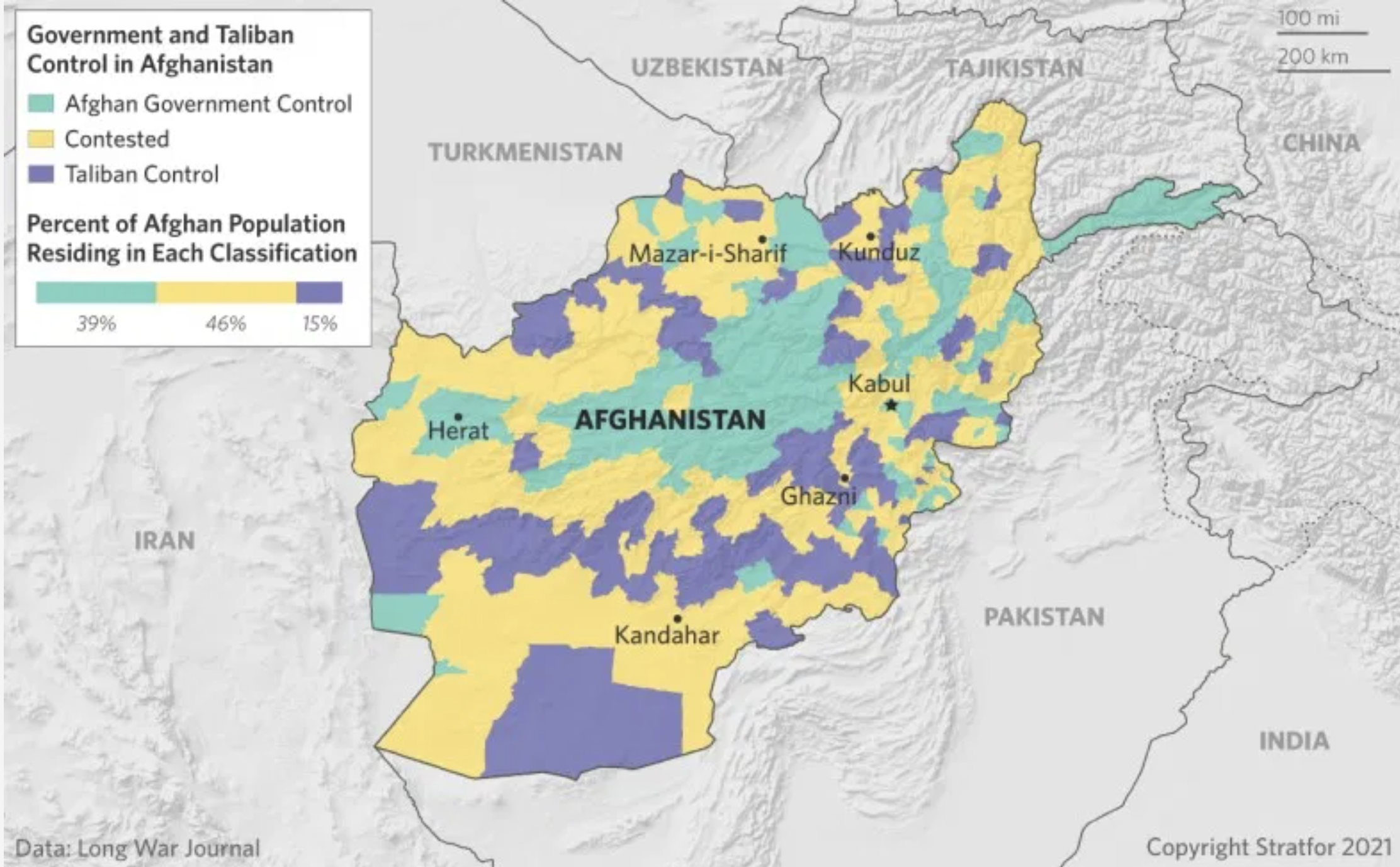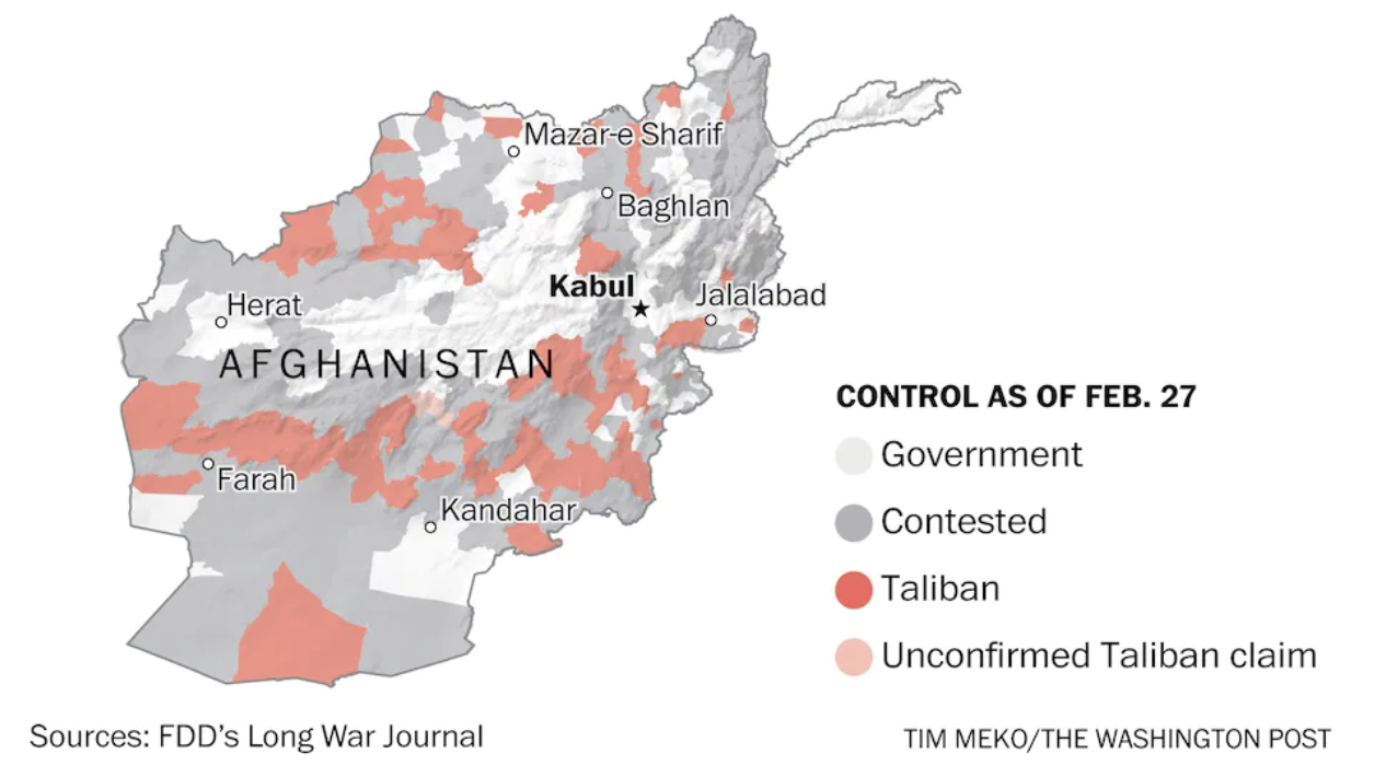 As we turn introspective about how presidential decision-making might have better coordinated military withdrawal, we must look back at the state of play as American Special Representative Khalilzad, who arrived in the State Dept. to advise on the Soviet-Afghan War in 1985-89, and the fragmented government control over the region we call “Afghanistan” at the time that the American withdrawal or drawing down of military presence that was agreed to on February 29. 2020. While we continue to conceive of “Afghanistan” as a nation, and map Taliban control within the inherited borders of Afghanistan by retaining the jagged boundary line determined by a local administrator of the British Empire in 1893, as if to posit the integrity of a region that the entrance of arms and sustained bombing has increasingly fragmented. Khalilzad, an ethnic Pashtun who had long funneled arms to Mujahideen, helped engineer the withdrawal of American troops when the Islamic Republic of Afghanistan poorly mapped onto the borders of the nation, based in cities like Kabul, Herat, Jalalabad, and Kandahar.