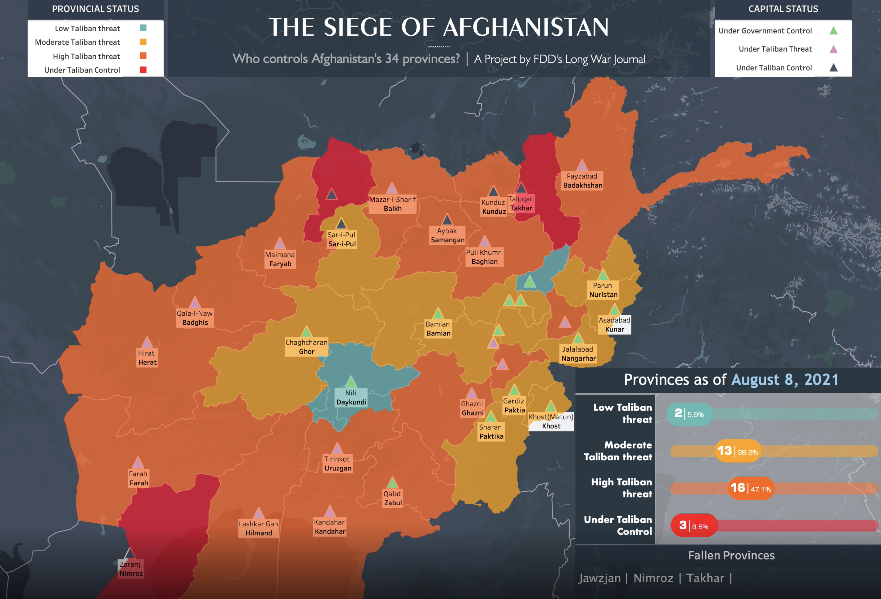10. The question of border-crossing Afghans was seemed omitted from the maps of the “Long War” that showed a patchwork of areas ruled by Afghanistan’s “government.” The balance of power in the nation was already unclear by April, 2021, in part because the majority of mapping of areas that the Taliban controlled were contested, and from a hawkish right-wing think tank, Foundation for the Defense of Democracies, whose graphics and animations Roggio dished out to journalists in the “Long War Journal,” have become a staple of wartime visualizations for a variety of news outlets, tracking the threat that the Taliban–a group he argues the United States never fully appreciated. The fall of thirty-two of thirty-four provinces reveals in its offensive success “a failure in leadership, intel and the military.” FDD was founded in the months after 9/11 to strengthen national security, and broadcasts plaudits for its assessing “the threats that we face” by former National Security Adviser H.R. McMaster and “protecting the country from the bad guys” by Antonin Scalia. Although this blogger has long championed the importance of open-source mapping tools and data, and even began in order to call attention to open-source mapping tools, the use of open-source data crafted a message for FDD, a proponent of active military engagement. It has become in the course of the war a clearing house of all news maps of the Afghanistan War is troubling–and demands unpacking, but is perhaps a casualty of the news data industry and the reliance on plundering online tools and data by limited news teams.