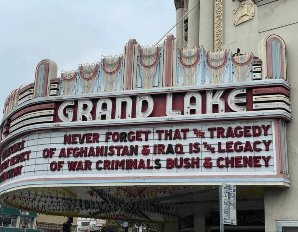 The assembly of visualizations sequence a “rapid takeover” of the terrain, of unexpected speed, as the consequence of a decision of an American chief executive, as if the proverbial fall of dominoes can be lain at the feet of the miscalculation of the President who inherited it. The “loss” of land seems to be demonstrated by the convincing “tactical” maps that appears to track an unfolding chain of events in real time; the visualizations come to possess an explanatory value of their own, removed from the deep instability of Afghanistan’s coherence, and the difficulties of fostering national coherence by the arrival of an increased amount of tactical gear and arms. Yet our local Oakland movie theater reminds us on its marquee, converted to a podium before closure of theaters, to push back on an apparent amnesia that these visualizations seeming to lay blame on the Afghans’ refusal to defend territory from the Taliban, that the absence of creating a convincing government in Afghanistan had deep roots, and the ground was often disrupted more than helped by foreign intervention and an increasingly open flow of arms.