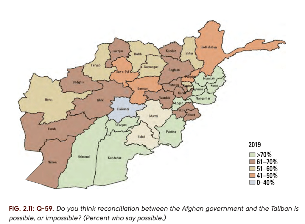 “Coalition” troop levels in Afghanistan had leveled off some time ago; but an astounding amount of military materiel and combat gear that remained across the region, discarded for the taking by advancing Taliban troops, contributed symbolically and tactically to the Taliban forces’ advance in ways that cannot be effectively mapped so far. The conspicuous brandishing not only of Russian AK-47’s by Taliban members, but shinier American-made M4 carbines and M16 assault rifles left by Afghani fighters recur on the Taliban’s active Twitter accounts–a keen sense of social messaging grown as active users for over a decade– signifiers of power that have caused several social media double-takes among American observers: the discarded rifles Afghan Security Forces abandoned provided a critical visual coin for social media resurgence of the Taliban since their first use of Twitter a decade after they were ousted from power in 2001, by posting with alarming rapidity to Jihadi Web sites, Facebook accounts and often suspended Twitterfeeds,–and to Afghan journalists. Per the Asia Foundation, by 2019, an increasing Afghans saw future reconciliation with Taliban forces inevitable, including large majorities of Southern and northern states, as well as those along the Pakistani border–few felt their security or livelihoods had been improved in recent years.