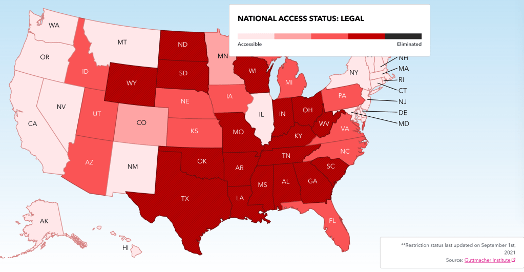 The reversal of this terrain of lack of access was the terrain on which SB 8 was launched, after Hellerstedt, attempting to shift “burden” from the woman whose right to elect to abort a fetus continued to be constitutionally protected by placing it on those who assist her. Rather than mandate a waiting period, parental consent, spousal notice, or admitting privileges the standard of “stage of pregnancy” that was affirmed in 1992 and, from 2016, mandated that restricting access to abortion must be framed in terms of furthering a state’s legitimate and compelling interest, effectively asking one to find a valid state interest in the following map that clearly suggests the limitations on individual rights: