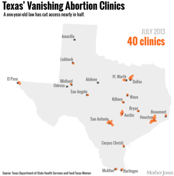Texas lies smack in the middle of these trigger laws and bans. The distances women must travel to clinics providing abortions are pronounced; the closure of many clinics from 2013, during the Obama Presidency, suggested a revolt against Roe v. Wade brewing on the ground, far from legal debates or at a remove; where the map of clinic closures constituted a serious reduction to the possibility of abortions, with closure of clinics widespread in the state, and open clinics only lying at green clusters that offered convenient access to only parts of the state, as huge areas compelled women to drive over a hundred miles to gain access to abortion–a restriction that was not viewed as “undue burden,” the standard that would be continued to be litigated in future years, by in 2016 preserving access to abortion for millions of women on constitutional grounds.