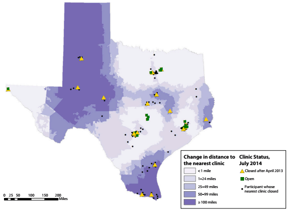 Texas lies smack in the middle of these trigger laws and bans. The distances women must travel to clinics providing abortions are pronounced; the closure of many clinics from 2013, during the Obama Presidency, suggested a revolt against Roe v. Wade brewing on the ground, far from legal debates or at a remove; where the map of clinic closures constituted a serious reduction to the possibility of abortions, with closure of clinics widespread in the state, and open clinics only lying at green clusters that offered convenient access to only parts of the state, as huge areas compelled women to drive over a hundred miles to gain access to abortion–a restriction that was not viewed as “undue burden,” the standard that would be continued to be litigated in future years, by in 2016 preserving access to abortion for millions of women on constitutional grounds.