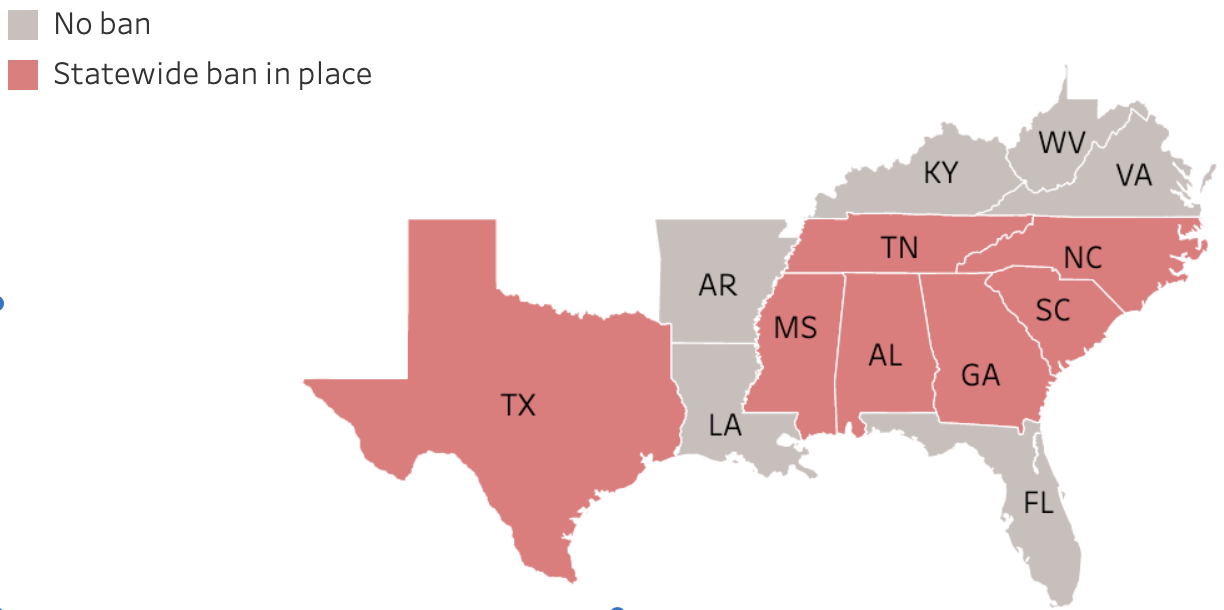The hope to reframe the law of the land is dressed in deeply coercive strategies, however, both surveilling women’s wombs by mandated sonograms and triggering a landscape of fear by dangling the promise of a bounty of a minimum of $10,000 to encourage a sort of righteous surveillance among extended family members, at school, or university, or at workplace settings, all of which offer ripe settings to snoop on any facilitation of an abortion or any suspicion that a pregnancy has been terminated after six weeks–netting the vast majority of abortions performed as few women are likely to be aware of pregnancy before a short month and a half window. The geography of restrictions on abortion is telling, and is a landscape that is confusingly changing, in ways that many will be both disoriented and confused, as it lacks uniformity. If Texas has long been seen as a “red” state, it is less “red” than on the cutting edge of promoting sonograms as a threshold limiting access to abortion–already limited beyond six weeks gestation in Idaho, Oklahoma, South Carolina, and Texas, as if preparing to send cases to a Supreme Court dominated by justices appointed by Donald Trump. The recent skyrocketing of six-week bans across the country in Mississippi, Kentucky, Ohio, and Georgia are a hangover of the Trump presidency, in which a new landscape of restrictions on reproductive health planned to spread to the state legislatures of Missouri and Tennessee. There is also traction beyond red states in filing for such bans by legislators Illinois, Louisiana, Maine, Maryland, Minnesota, New York, South Carolina, and West Virginia.