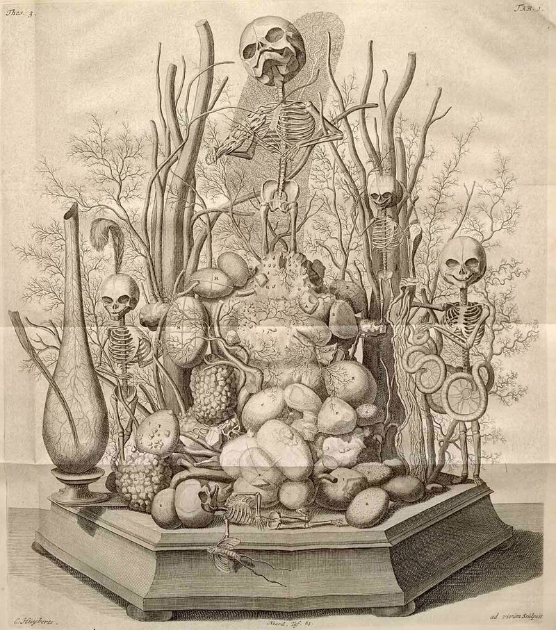Fetal still-lives became a genre of memento mori of added charge as. a carefully constructed cabinet of curiosity, posing questions of the start of life and the nature of death, and the limits of birth: more than cast himself as a seventeenth century Gunther von Hagen in his use of “real” body parts, Ruysch hoped to “preserve the honor and dignity of the soul once housed in these bodies” in miniature treasures of curiosity that posed poignantly compelling questions of the start of life with their ungainly large heads. Displaying the museum in Amsterdam houses, rather than an anatomy theater, in multiple rooms of skeleton remains, Ruysch revealed his dexterity as an embalmer by mounting fetuses among his preparations arriving from other continents as a condensation or summary of worldliness of amplified curiosity, skirting the borders of fetal morbidity and the deep taboos it posed. The unborn child was the emblem of a liminal moment between life and death, perhaps more than a human cadaver, as the definition between “humanity” and animated life in the fetus so difficult to discern, if it might be tried to be pinned down by prodding the fetus for involuntary neural reflexes as Zerbi, seeking the appearance of a human form, as Galen or Coiter and Platter, or another telling sign, as the heartbeat now visually registered by an ultrasound. Ruysch’s audience seemed to delight in seeing the mannequin of the fetal or children’s skeleton animated among a sort of terrarium still life, against corals and dead insects, the centerpieces of a still life of death.