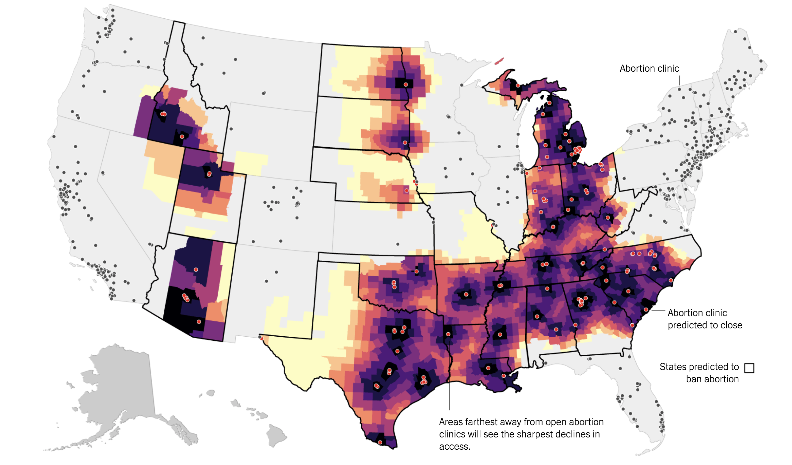 The fear of similar edicts, playing more on empathy to the unborn more than medical science or medicine, has already sent many fleeing state lines for better health care, and we have yet to gain compelling maps of the out-of-state flight or traffic beyond state boundaries to seek abortions, as we lack a better map of crossing state boundaries for seeking better health care for coronavirus infections in states where mandates for unmasking have elevated local case loads–or the flooding of urban clinics with requests for abortion procedures from those living in rural areas, already suggested in this national map. Yet in much of the nation, we can already see a curtailing of geographic access to abortion providers that has already changed the landscape of public health care–even as access to abortion seems relatively “safe” in the nation as a whole. How to read this map? It seems not a matter of reading the glass as half-empty or half-full, but an intent to restricting the legality of access to reproductive health.