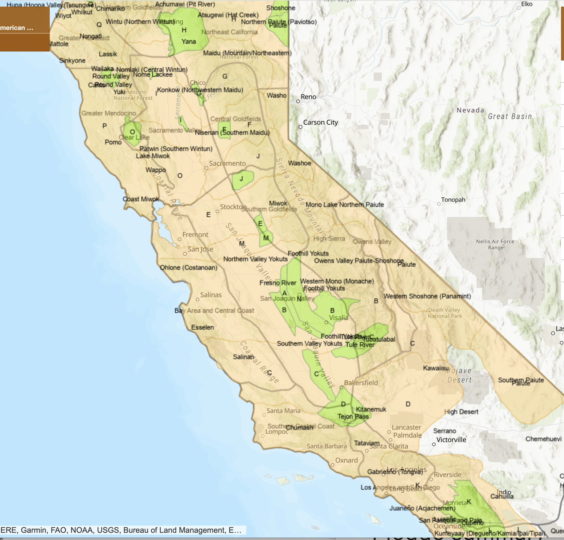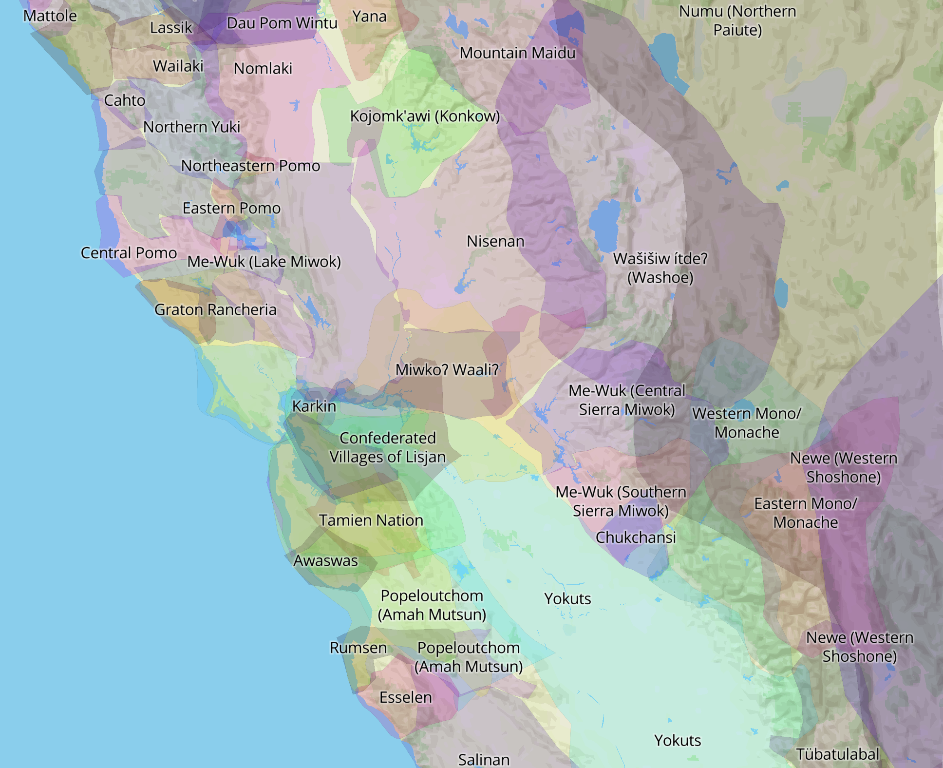 Is crowd-sourcing a better way to achieve buy-in to a sense of stakeholding in a regional map? Or is this sense of DIY boundary-drawing not really the point, as much as the fluidity of the boundaries, which pop out for each region, lending an integrity to Coast Miwok, Oholone, Southern Pomo, Plains Miwok, Sierra Miwok, Northern Yuki and Patewan, among others, as a click, invests a far greater sense of presence and agency on the map, and indeed raises the question of how it might demand to be translated, if possible, to paper form, and to be taken off-line.