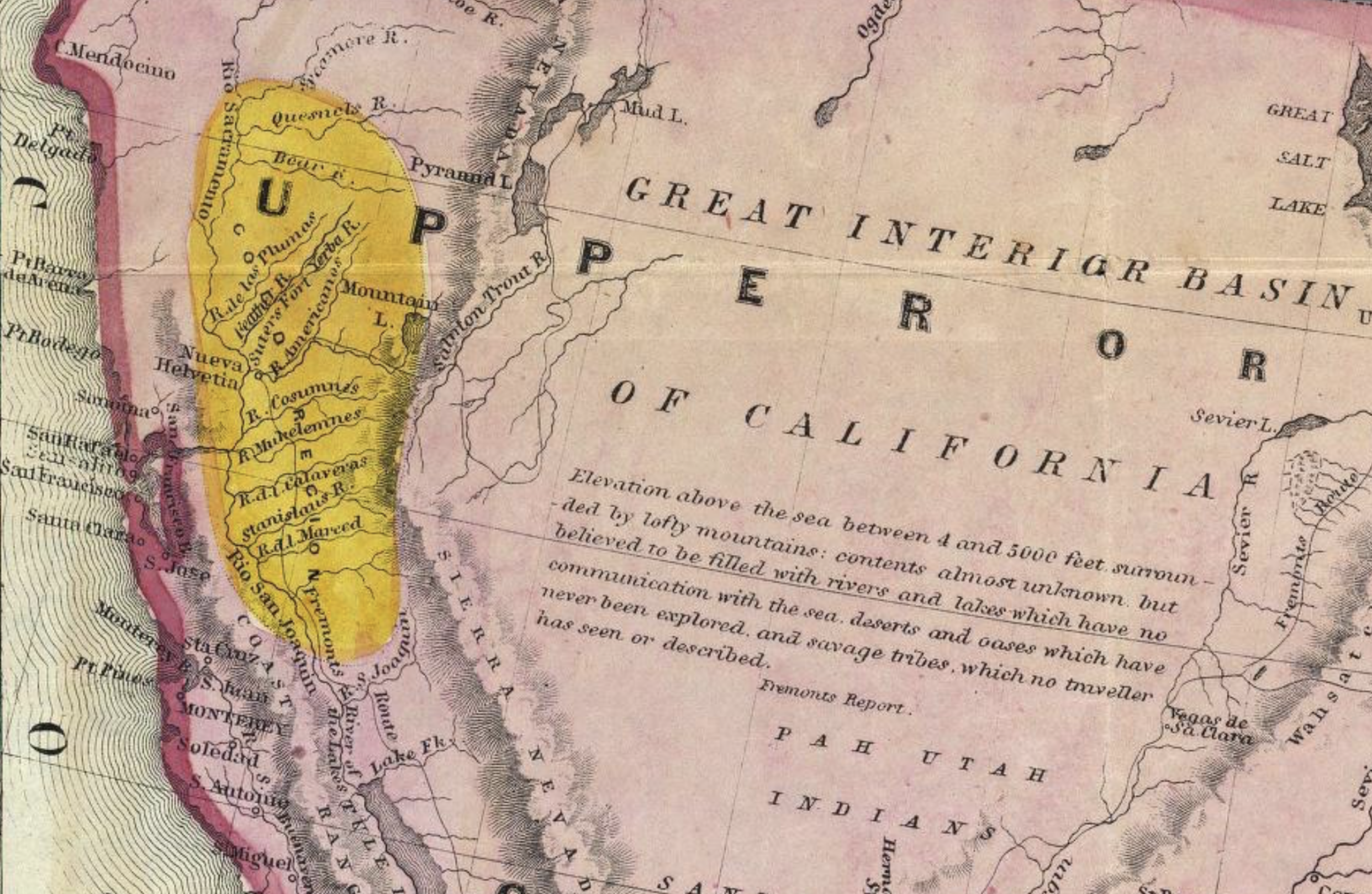 –and maps for those considering “emigrating to California” either as settlers or for business, in 1848 depicted the necessary sea routes to a land where a region indicated by a golden ochre lay inland from Santa Cruz, approximating a northward shifted Central Valley, in a mythos of acquisition that pushed all indigenous residents of Upper California into the interior, beyond the Sierra Nevada mountains, the sole province of Utah Indians, Mohauks, and other nomadic peoples, who had no title to the land.